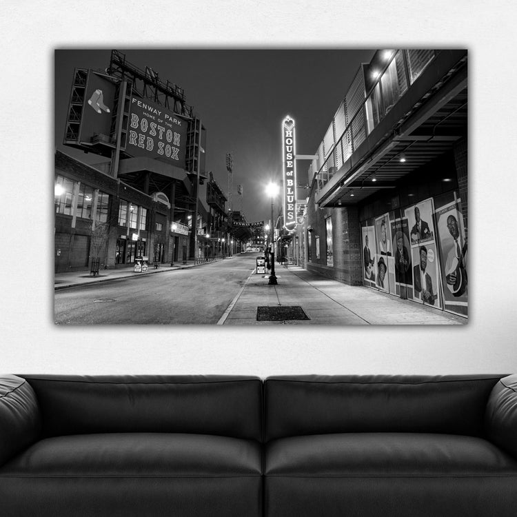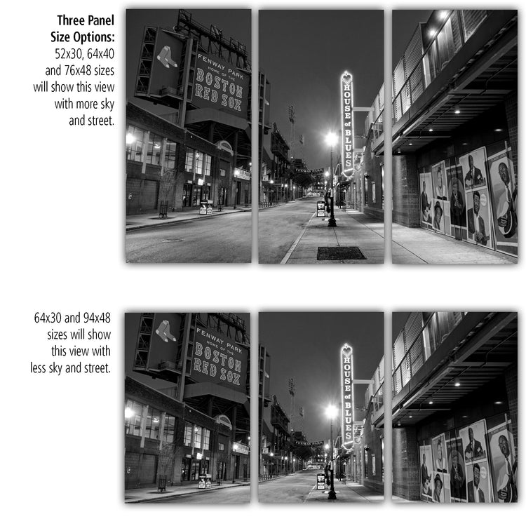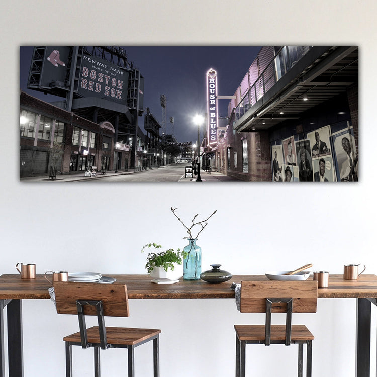 A vibrant night shot of Boston Red Sox historic Fenway Park and its famous Green Monster alongside the House of Blues. Makes a great gift and perfect art to fill a large wall above your sofa. Available in 3-Panel sizes up to almost 8' wide, and Single-Panel sizes up to 5' wide . A variety of sizes to fit any wall, and in 3 great color options: vibrant color, muted color and black & white.