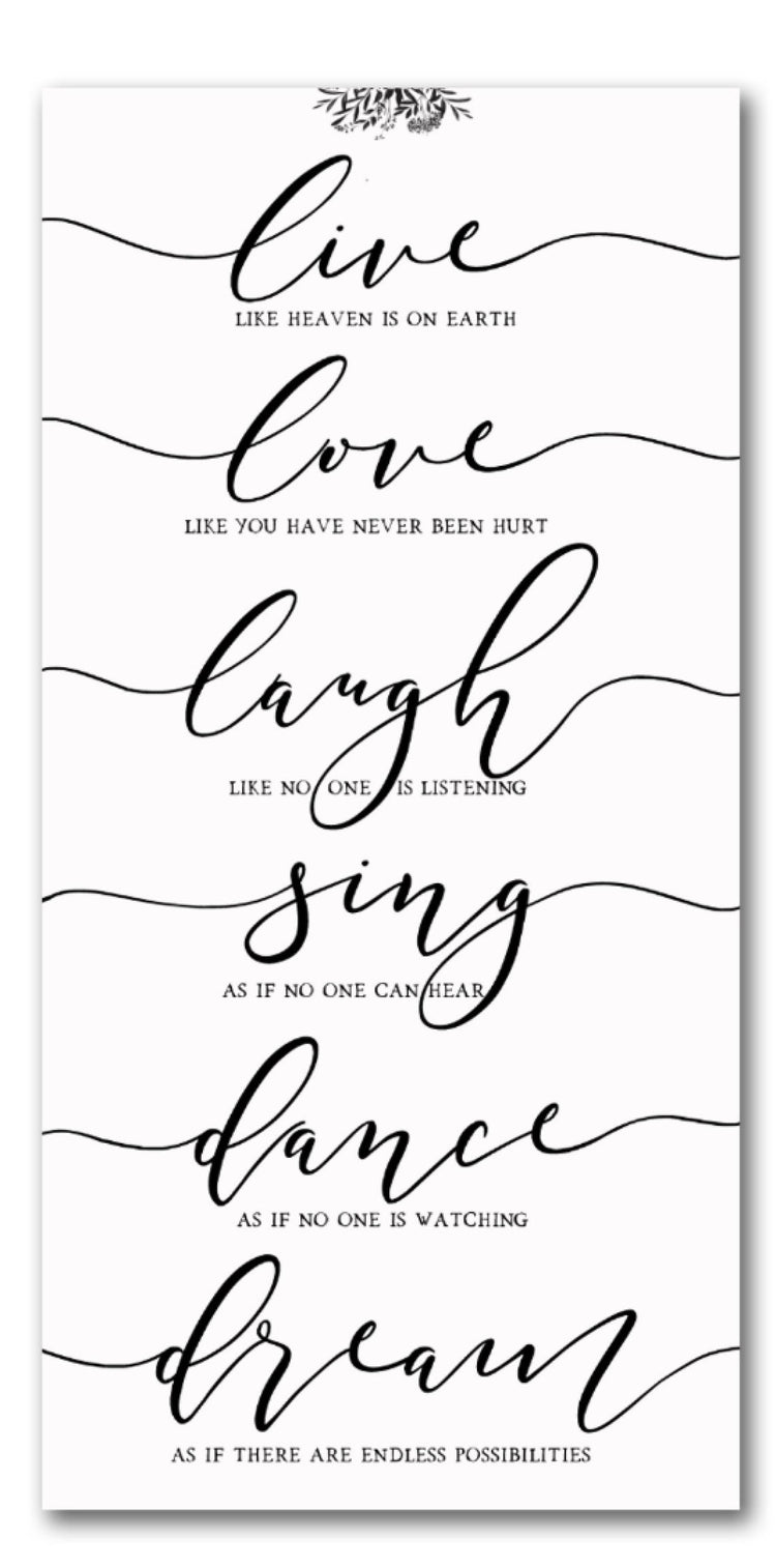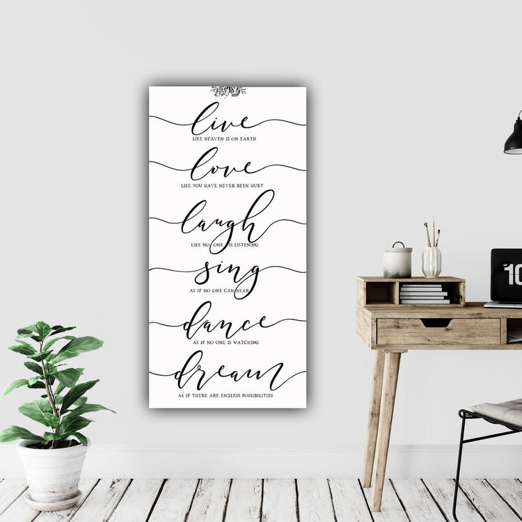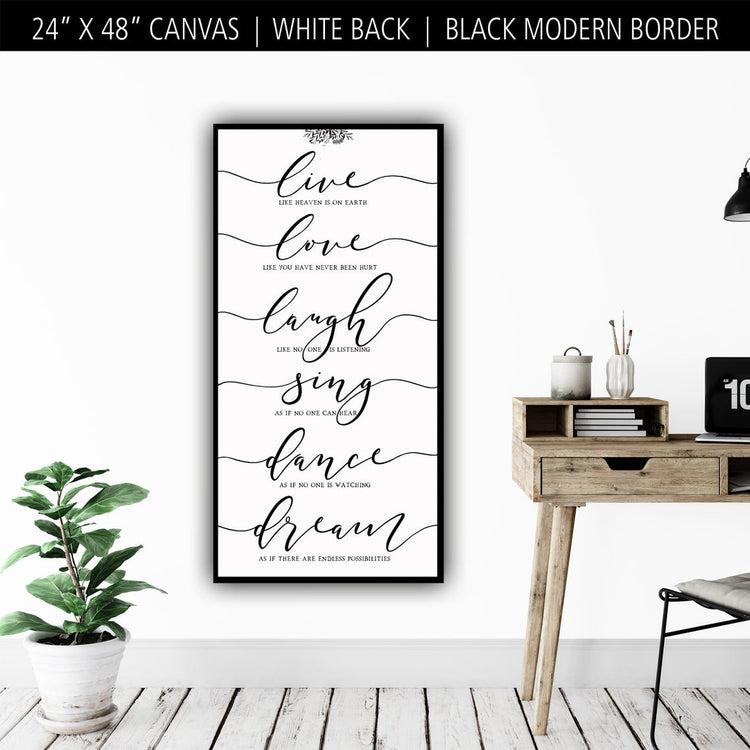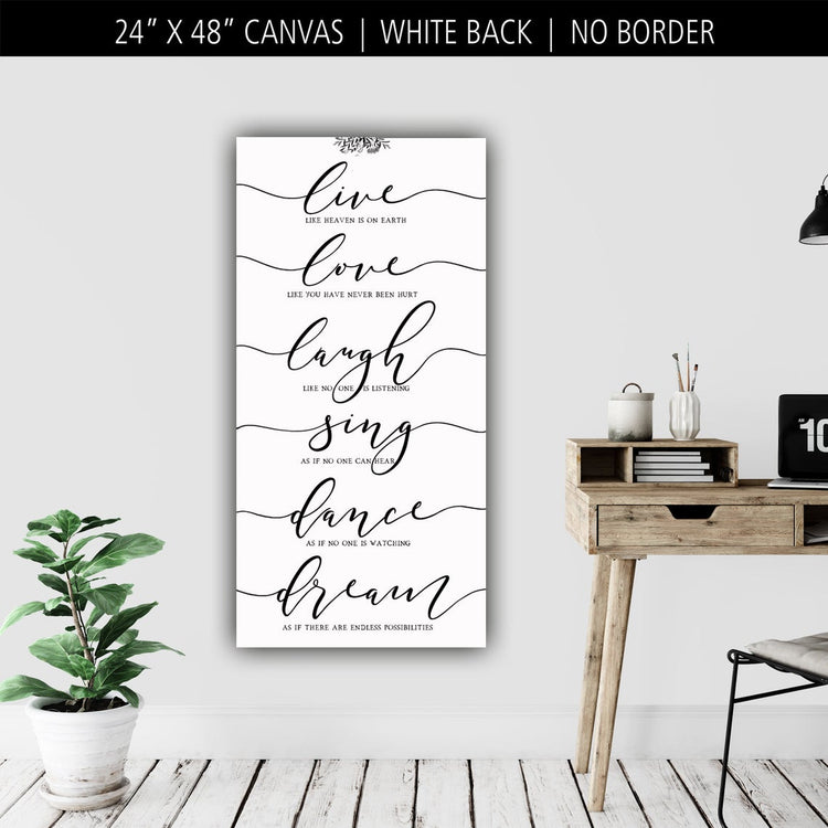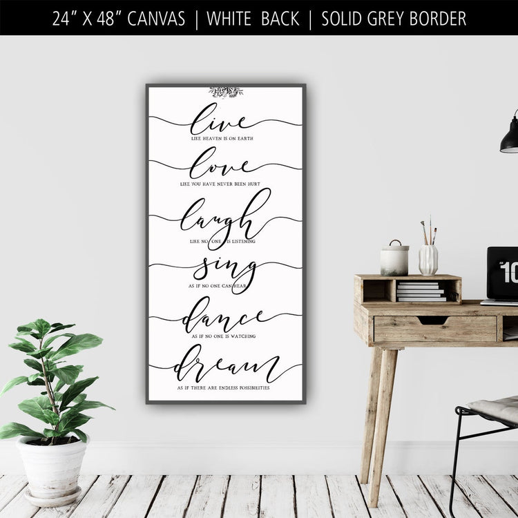 Live Laugh Love Farmhouse Sign adds the perfect charm to your modern farmhouse home. White or Whitewash background with minimalist text and printed on a premium canvas provides for a simple, clean and sophisticated appearance. Choose from a solid border-frame or a simulated wood border. Wood-like border/frame is also printed on canvas making it extremely lightweight and easy and ready to hang. Inks are tested for a 100+ year lifespan. Extra Large artwork shown is 48 inches tall. Quality Guaranteed. Text reads: Live like heaven is on earth, Love like you have never been hurt, Laugh like no one is listening, Sing as if no one can hear, Dance as if no one is watching, Dream as if there are no possibilities.