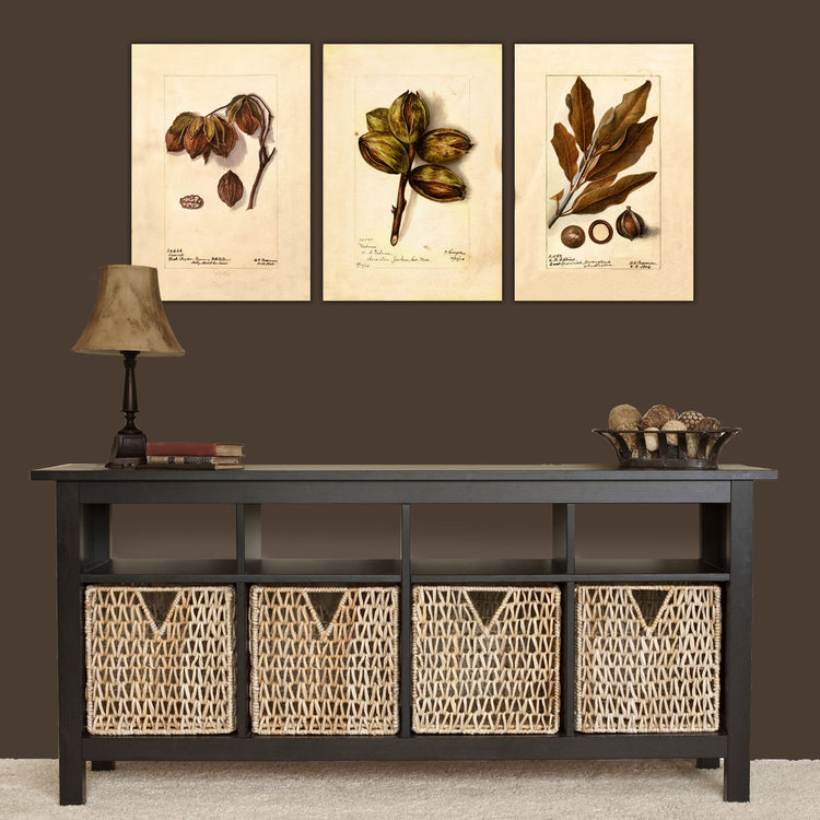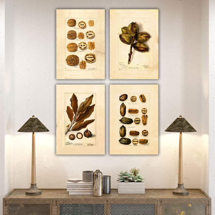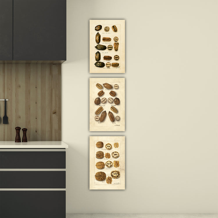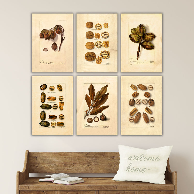 Mix and match from 6 beautiful prints to create your perfect set of vintage nut sketches. Dating from the early 1900s, these prints show a variety of nuts including pecans, walnuts and macadamias. Rich golden brown tones bring warmth to any room. Choose an individual print or a set of up to 6. Prints are available in sizes from 14 to 30 inches wide!