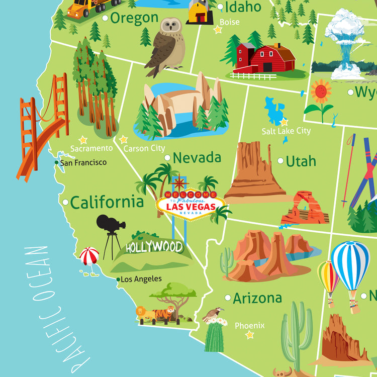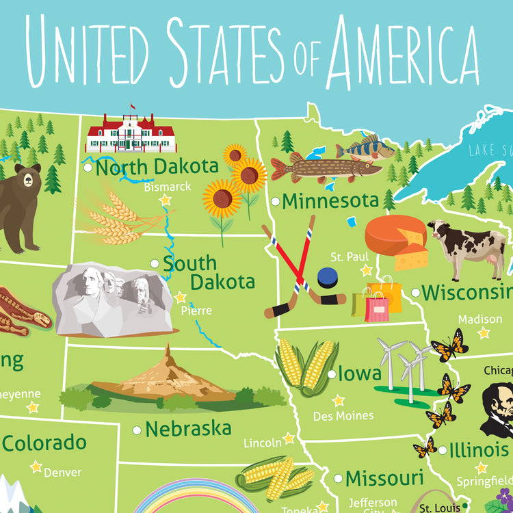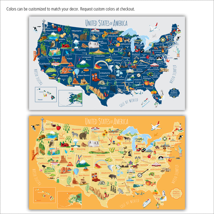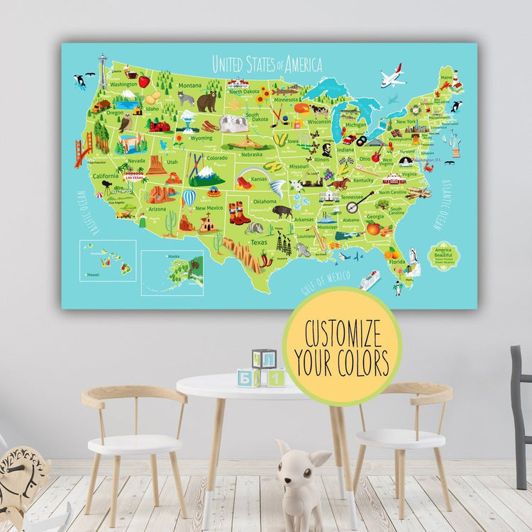 Kids USA Push Pun Map. Customize the header and/or the legend for a personal touch, and Customize the colors to match your decor. It's educational, fun, interactive art for your Nursery or kids room. How many states have you visited? Where would you like to go? Can you find Vermont? Helps teach geography and state capitals. Have your kids research states to explore what to do and where to go on your next vacation. Kids pin States Visited and Dream Vacations --helps cherish your family vacation memories. You can even pin pictures on the edges.
