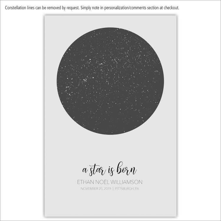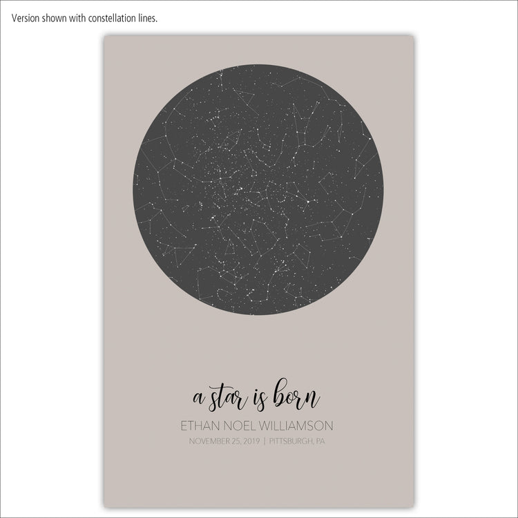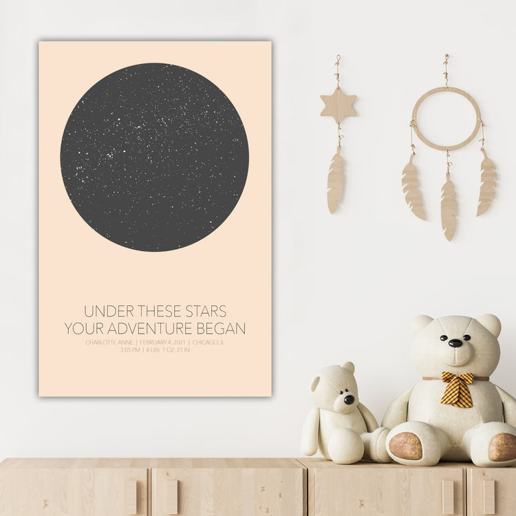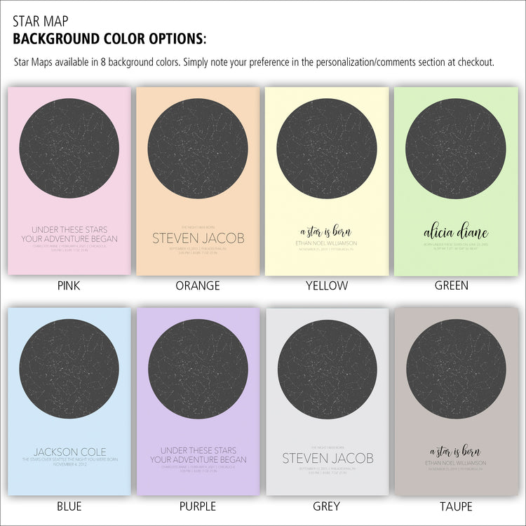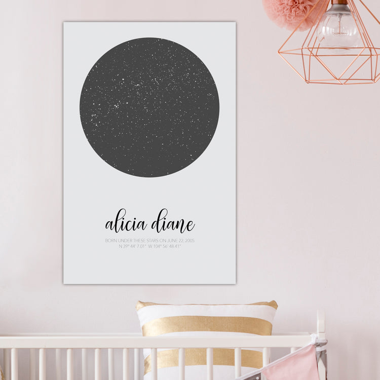 Oh Baby! What a great Newborn gift perfect for the nursery. Choose from a variety of pastel colors or trendy grey or taupe. Our Star Map shows the stars specific to the location, date and time of that special day. It's one of the most customizable Star Maps you'll find and no additional framing is necessary. Looking for a unique first birthday or newborn gift? Give the gift of the stars!