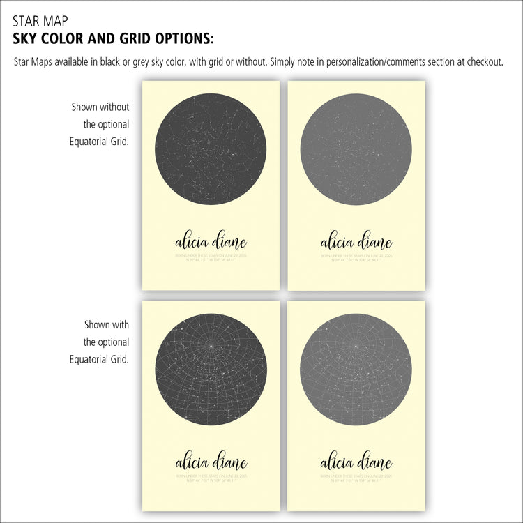 We want you to be 100% happy with your Star Map. All Star Maps will be proofed out before printing. We will use our design expertise and work with your suggestions to create your masterpiece. Proofs are generally sent out 1-2 days after your order is placed, so please be watching for these to avoid delays. We will NOT ship until you approve your customized Star Map.
