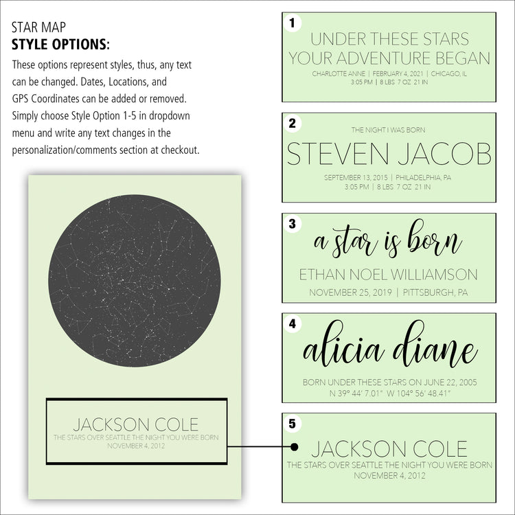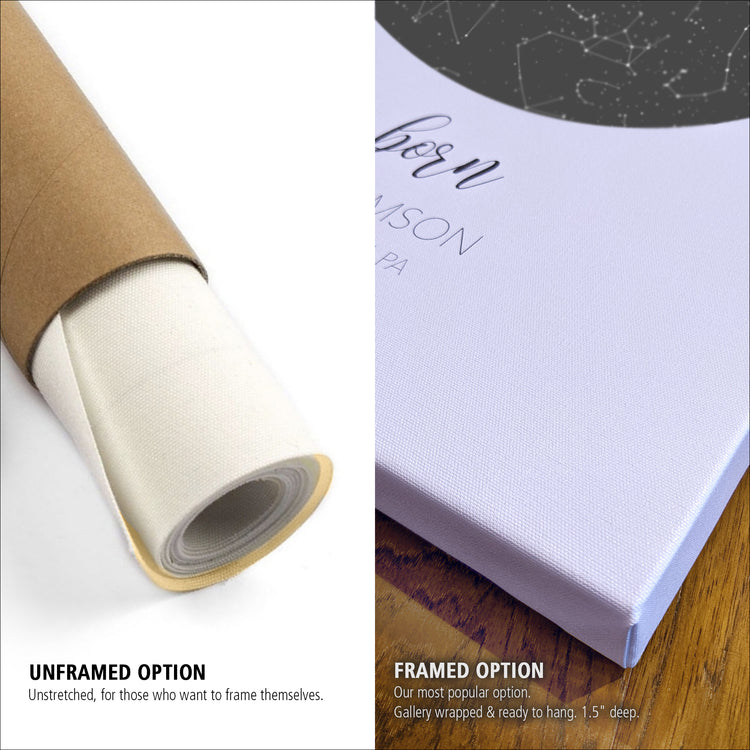 We love personalizing your Star Map! Choose from our style options and nearly endlessĀ text possibilities. Add names, location and date to make it truly unique. Enter in the ā€œPersonalize Your Canvasā€ textbox.