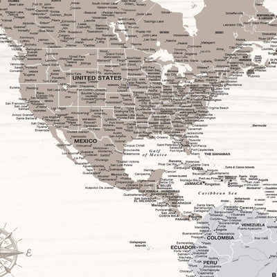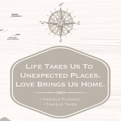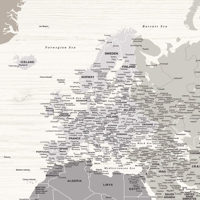 Our Farmhouse Push Pin World Map is both beautiful modern farmhouse wall art AND a push pin map to track travels taken and travels planned. Map features a whitewash wood grain background with farmhouse grey, taupe, and white colors on a premium stretched canvas. Easy-to and ready-to hang; no additional framing necessary. Foam-like backing ensures pins stay intact. The perfect gift for any traveler. Map measures 60" x 40"