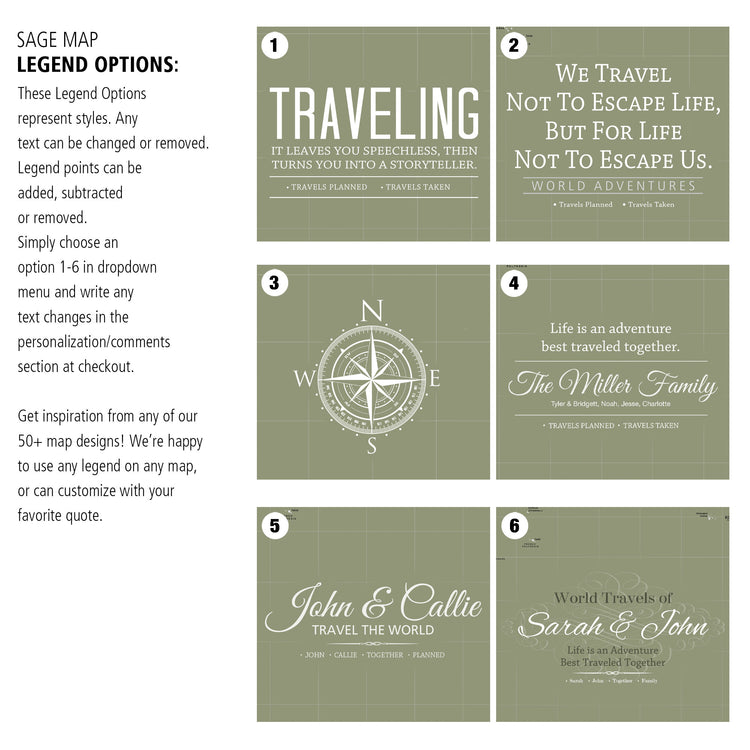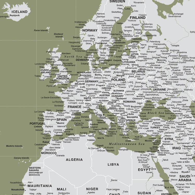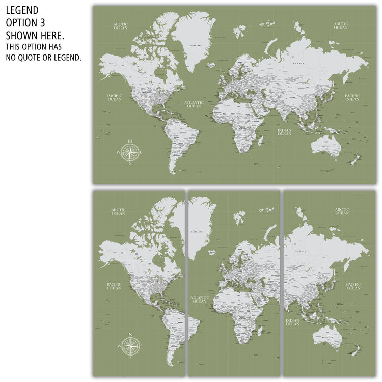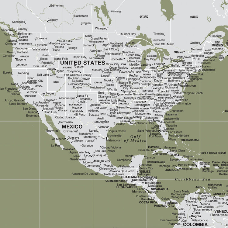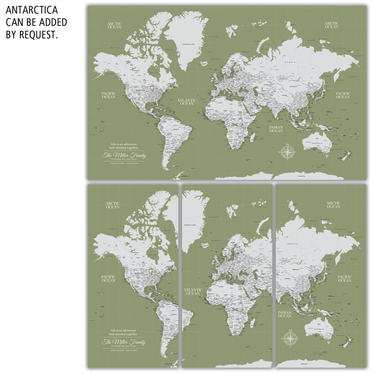 Highly customized, highly detailed Push Pin World Travel Map with light grey on a Sage Background. Map features current, up-to-date countries. Great clarity with excellent city and country details, map is READY to HANG. No additional framing necessary. Foam-like backing under our special, blended canvas ensures your pins will stick and stay intact.
