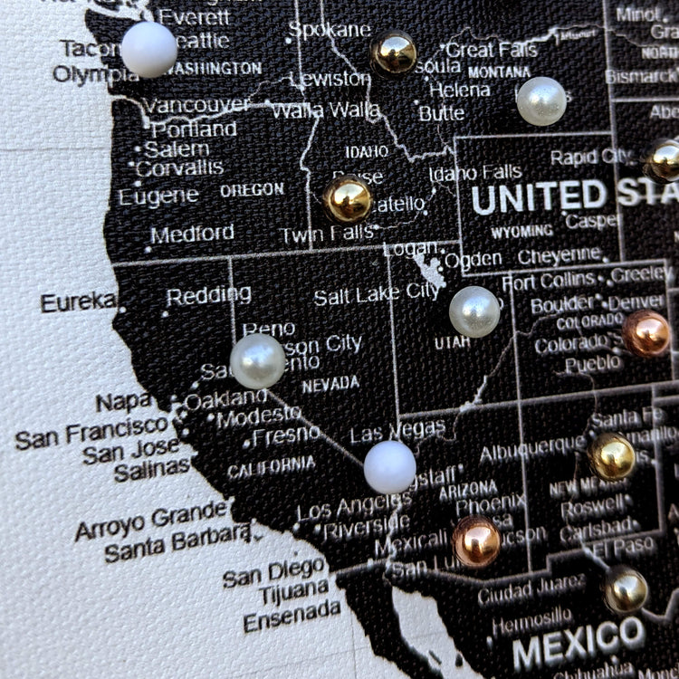 I use my map, the metal motorcycle, and colored, plastic pins to show my travels around the USA. My map is a focal point in our living space and I love the way folks are drawn to it and how it promotes conversations! I love my Holy Cow Map!!