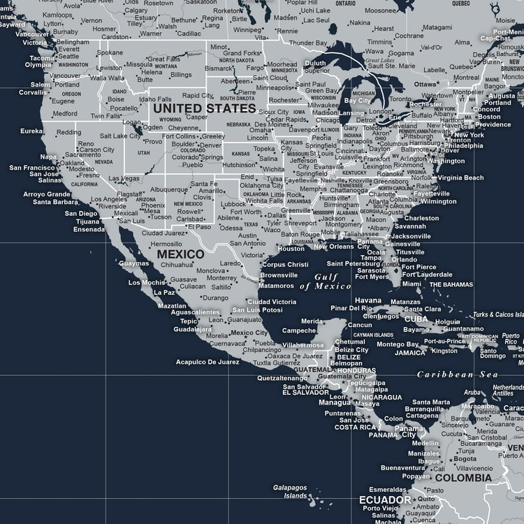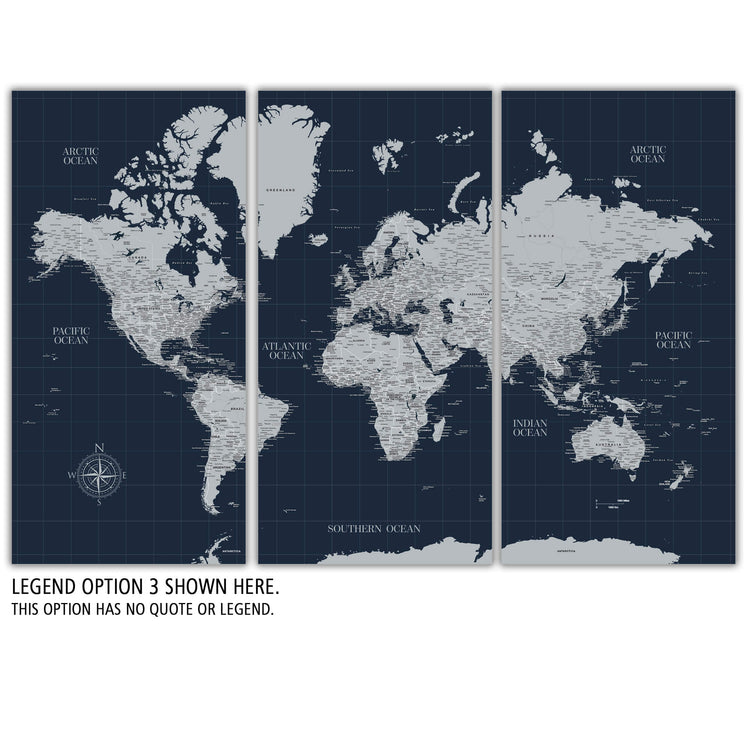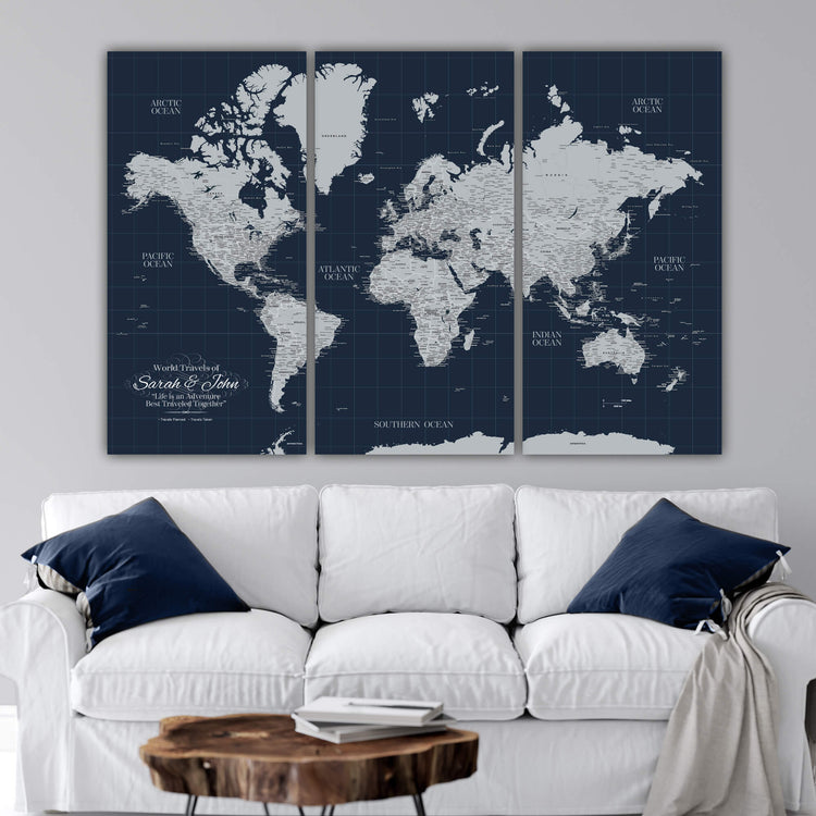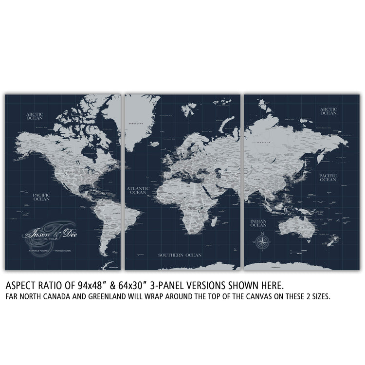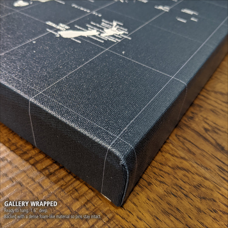 Navy Push Pin World Travel Map Gallery Wrapped & Framed Canvas makes a statement on any home or office wall. Size shown in main photo is more than 6 feet wide (76x48"; many sizes available)! Map features superb clarity with excellent city and country detail. Foam-like backing under our special blended canvas ensures your pins stay intact.
