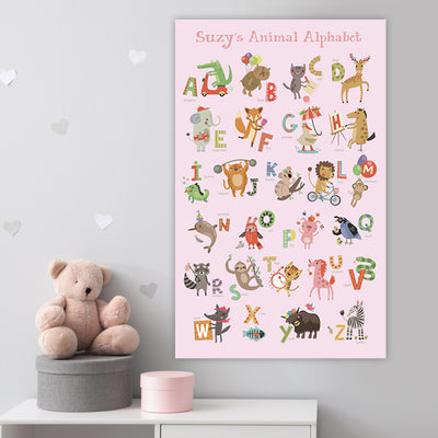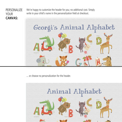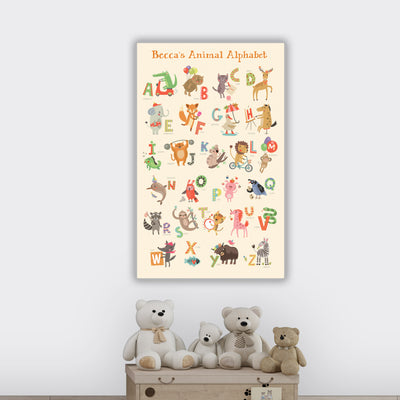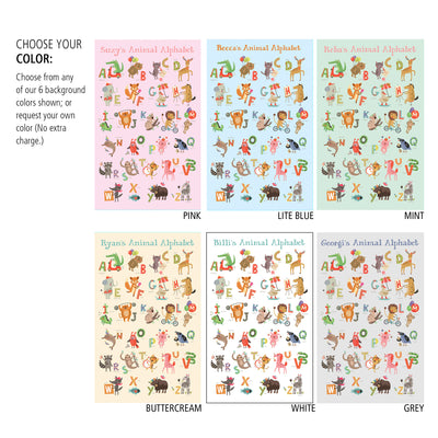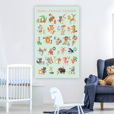 Our Animal Alphabet Wall Art is ideal for your new nursery or child's bedroom. Measures up to 4 feet tall or available in smaller sizes. Six color choices shown coordinate with most decor; but we're happy to customize the background color for you as well. Title at top can be personalized with baby's name; simply request at checkout. Makes a unique baby shower or newborn gift and is gallery wrapped canvas; framed and ready to hang in the most upscale and trending bedroom.