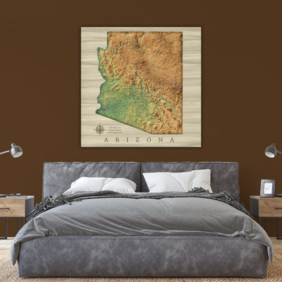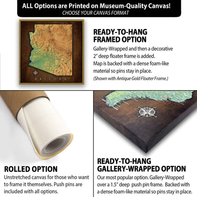 Our Arizona State Push Pin Map with Terrain allows you to pin the places you have traveled or have lived in Arizona. Beautiful as wall art showcasing your state pride but fun to start conversations. Superb clarity with more city and towns. Holy Cow! "NO CHARGE" for personalization. Makes a great wedding, anniversary, new home or graduation gift to commemorate one's roots for a truly custom gift. Highly detailed map features roads, highways, interstates, rivers, lakes along with National Parks & Forests, and military sites. Our Arizona Map is gallery-wrapped with a "premium" canvas--better than your box-store quality. Foam-like material under canvas ensures pins stay in place. Lightweight, Easy & ready-to-hang; no additional framing necessary, but Rolled option is available for those who want to frame map themselves (DIY). Made in the USA!