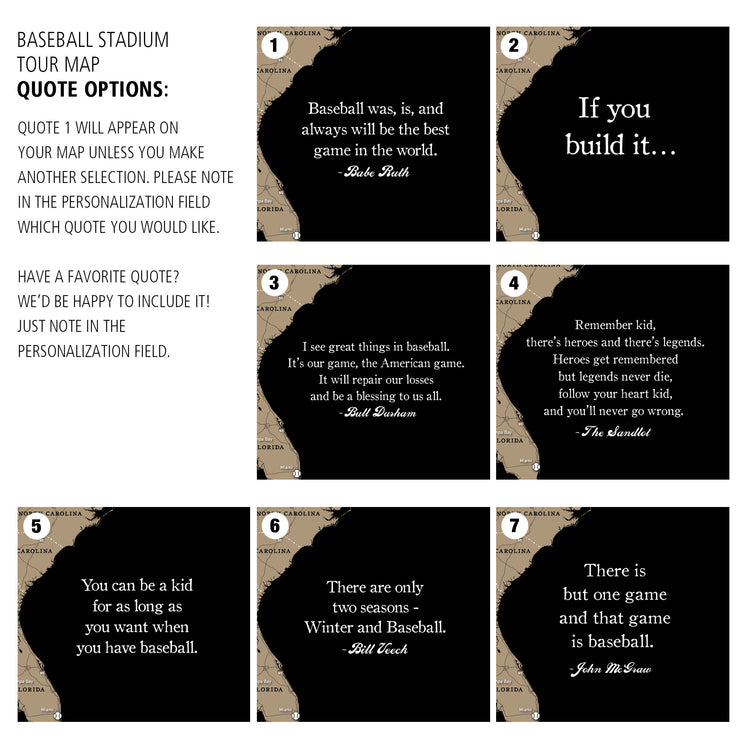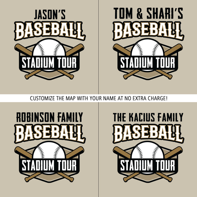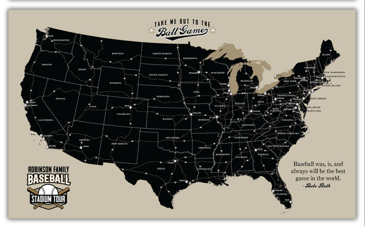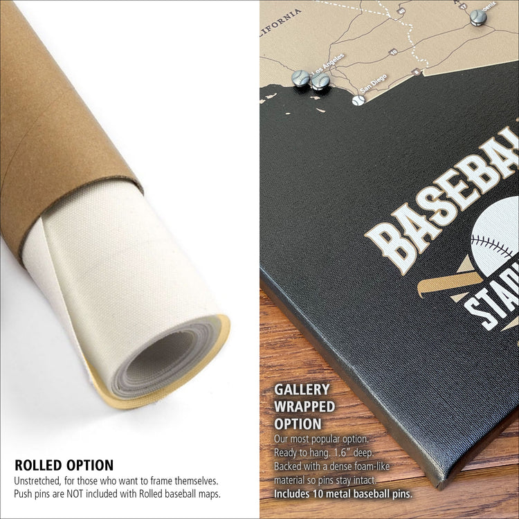 Our Classic Baseball Stadium Tour Map, features a crisp clean style and shows the location of all 30 Major League Baseball stadiums (plus the Baseball Hall of Fame)! Each stadium's location is marked with a baseball, which you cover with a metal baseball pin to show your visit. Choose from 8 classy, elegant maps, stylish enough for your child's bedroom, man cave, or executive office. Printed on premium canvas; 10 metal pins are included with our gallery wrap options! Interstate signs and highways are a nice touch to highlight your road trips! Personalize your map with your name and favorite baseball quote for FREE for a nice custom touch. Sizes available from 24 to 60 inches wide! Map is Ready to hang–no additional framing necessary; or choose "Rolled" options for those who want to frame map themselves. Holy Cow! The perfect gift for your baseball enthusiast.