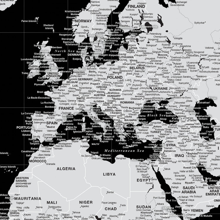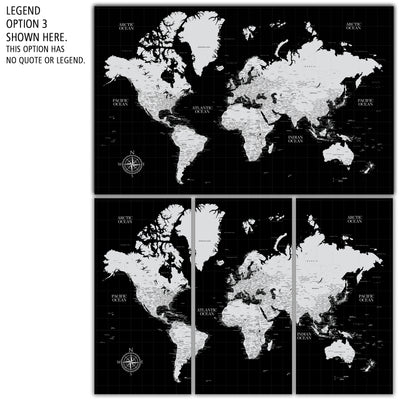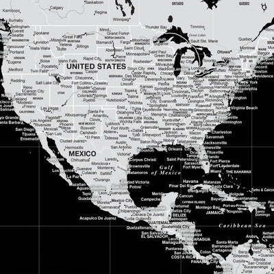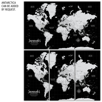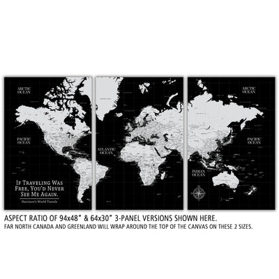 Highly customized, highly detailed Push Pin World Travel Map with white on Black Background. Traditional, Modern or Classic, this map coordinates with most styles. Great clarity with excellent city and country details, map is READY to HANG. No additional framing necessary. Foam-like backing under our special, blended canvas ensures your pins will stick and stay intact.