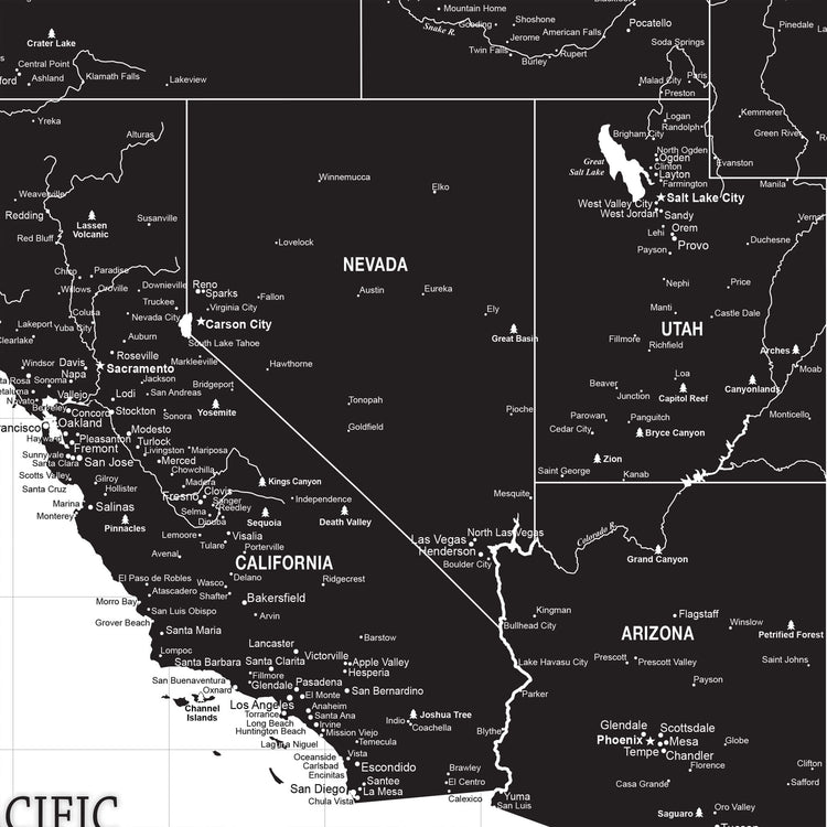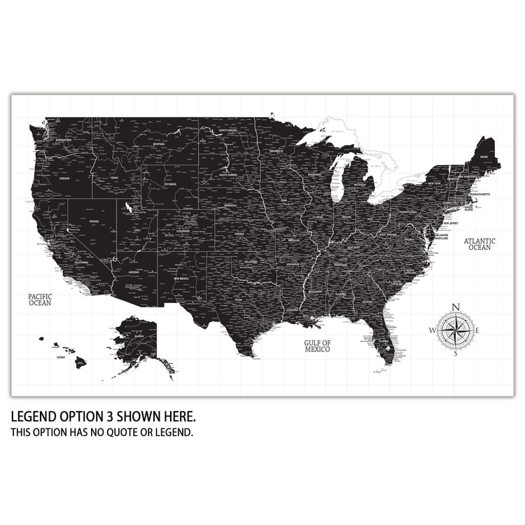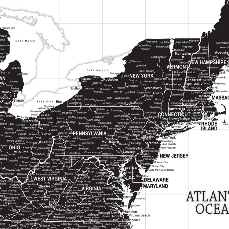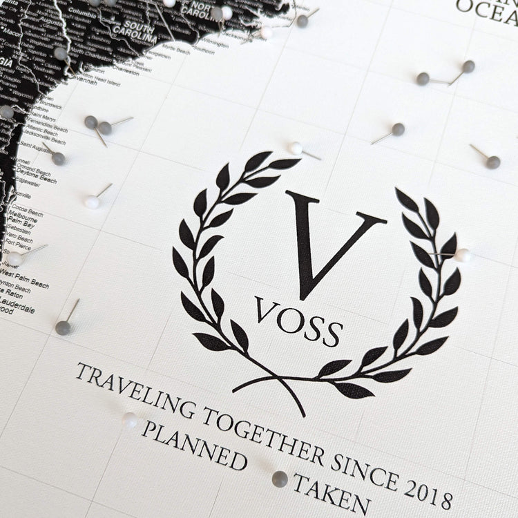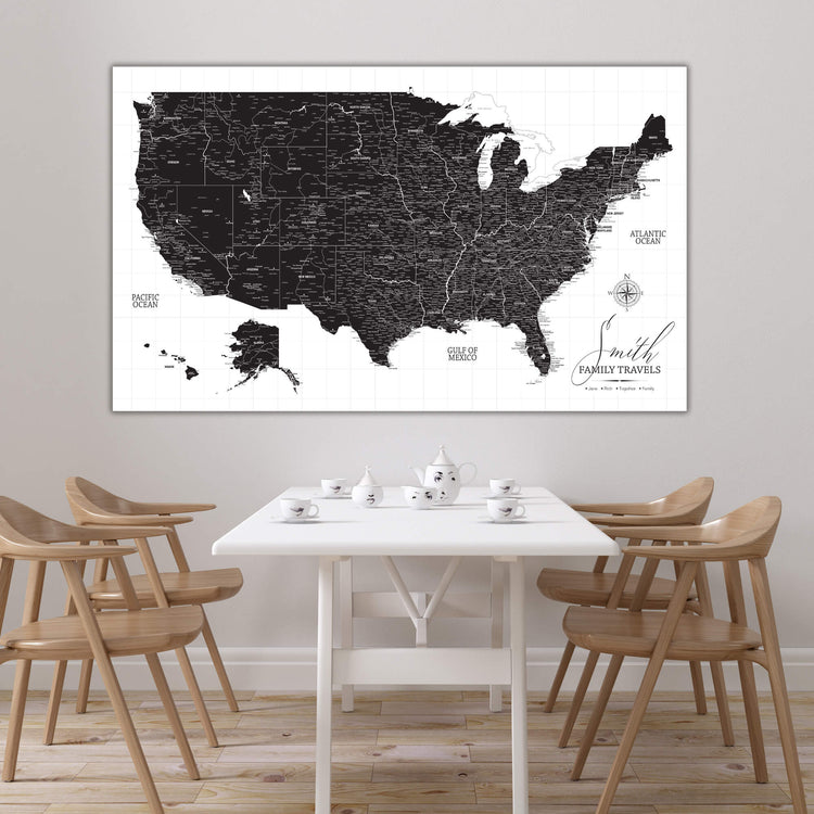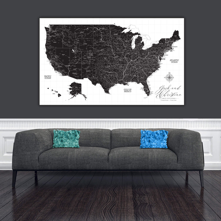 Black & White USA Push Pin Travel Map on white background makes for a great way to record and plan your travels and have nice, large art to fill your walls. Framed with Gallery-Wrapped canvas, makes a great conversational piece when guests come to visit, or give as a wedding, new home or travel gift. This customizable map features superb clarity with excellent details at any size. Ready to hang - no additional framing necessary. Superior foam-like backing under our special, blended canvas ensures your push pins will stay intact. Map includes National Parks.