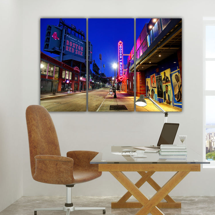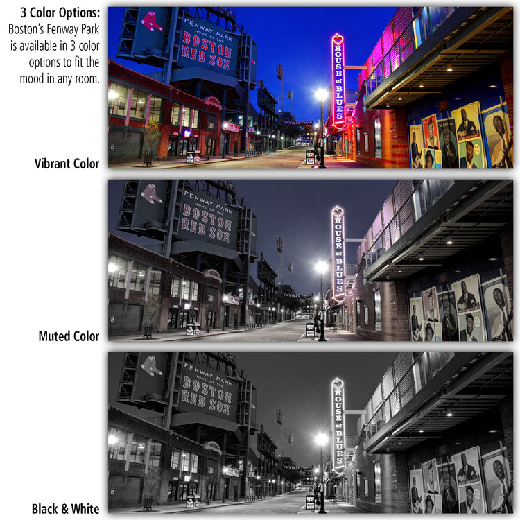 A vibrant night shot of Boston Red Sox historic Fenway Park and its famous Green Monster alongside the House of Blues. Makes a great gift and perfect art to fill a large wall above your sofa. Available in 3-Panel sizes up to almost 8' wide, and Single-Panel sizes up to 5' wide . A variety of sizes to fit any wall, and in 3 great color options: vibrant color, muted color and black & white.