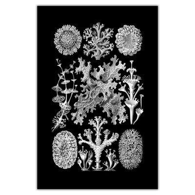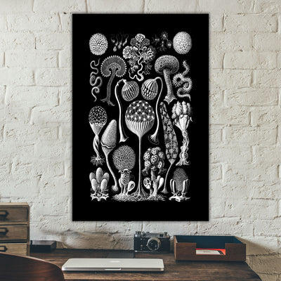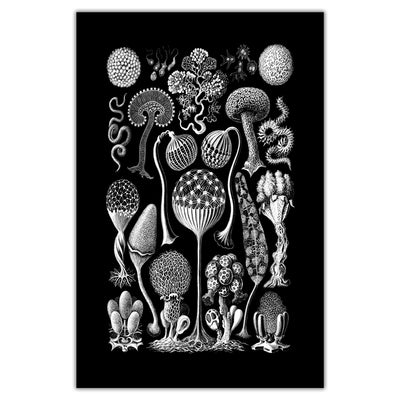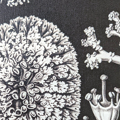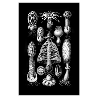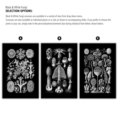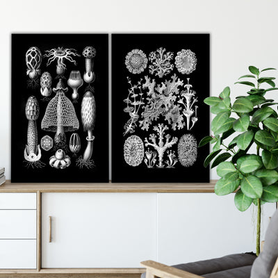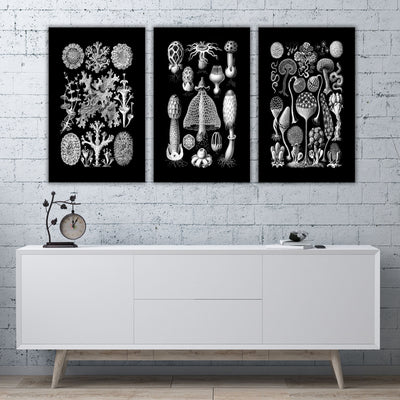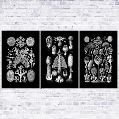 3 stunning black and white botanical prints from Ernst Haeckel's 1904 book Kunstformen der Natur (Artforms of Nature). Vintage Victorian art on archival canvas. As quirky as they are elegant, these scientific illustrations of mushrooms, lichen and slime mold highlight the beauty of nature around us. Choose an individual print or a set of 2 or 3. Prints are available in sizes from 10 to 48 inches wide!