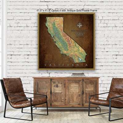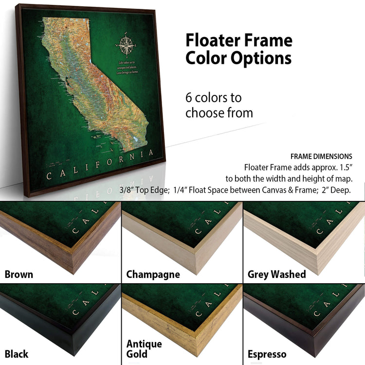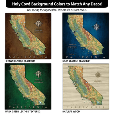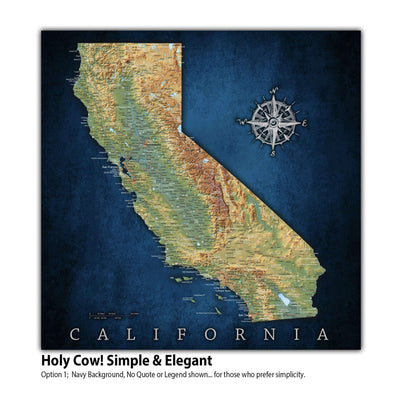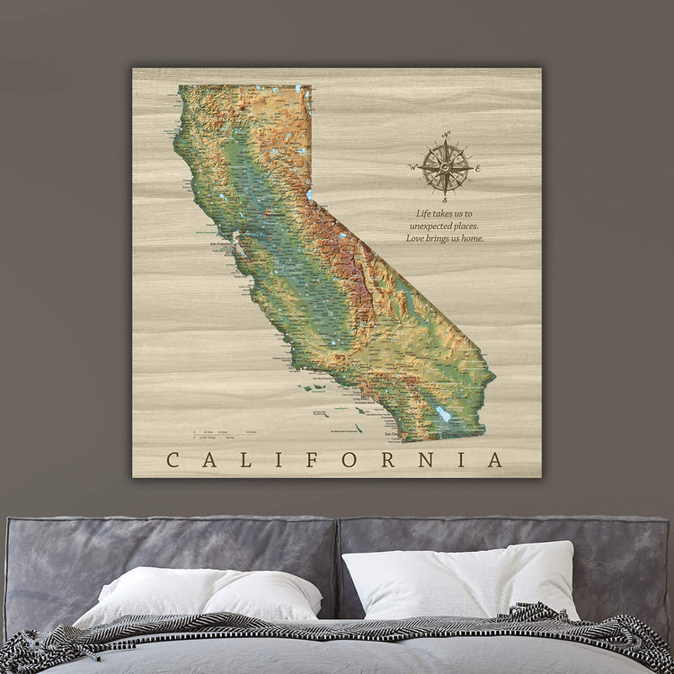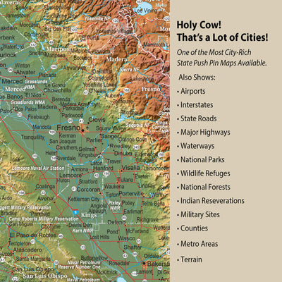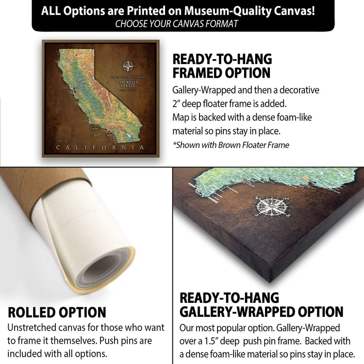 Our California Push Pin Map with Terrain allows you to pin the places you have traveled or have lived in the great state of California. Beautiful as wall art showcasing your state pride but fun to start conversations about your favorite places traveled. Makes a great wedding, anniversary, new home or graduation gift to commemorate one's roots, and is customizable for a truly personal gift. Available in 4 background color options to coordinate with most decors. Highly detailed state map features roads, highways, interstates, rivers, lakes along with National Parks & Forests, and military sites. Superb clarity with abundant city and towns. California State map is gallery-wrapped with a premium canvas; foam-like material under canvas ensures pins stay in place. Easy and ready-to-hang; no additional framing necessary.