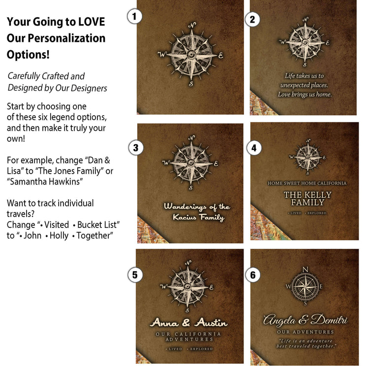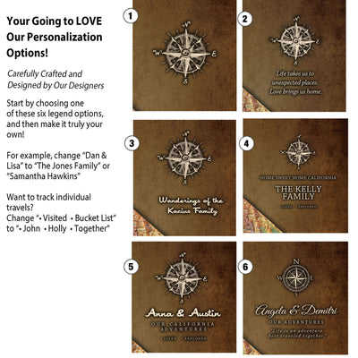 The map can be fully customized. Choose from the quote & legend options shown. Type your custom text in the “Personalize Your Canvas’ field.