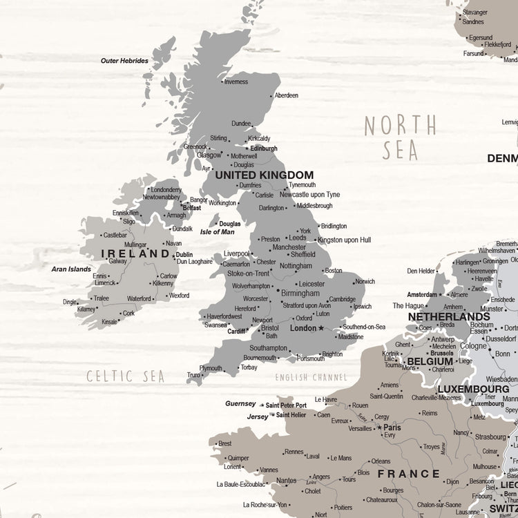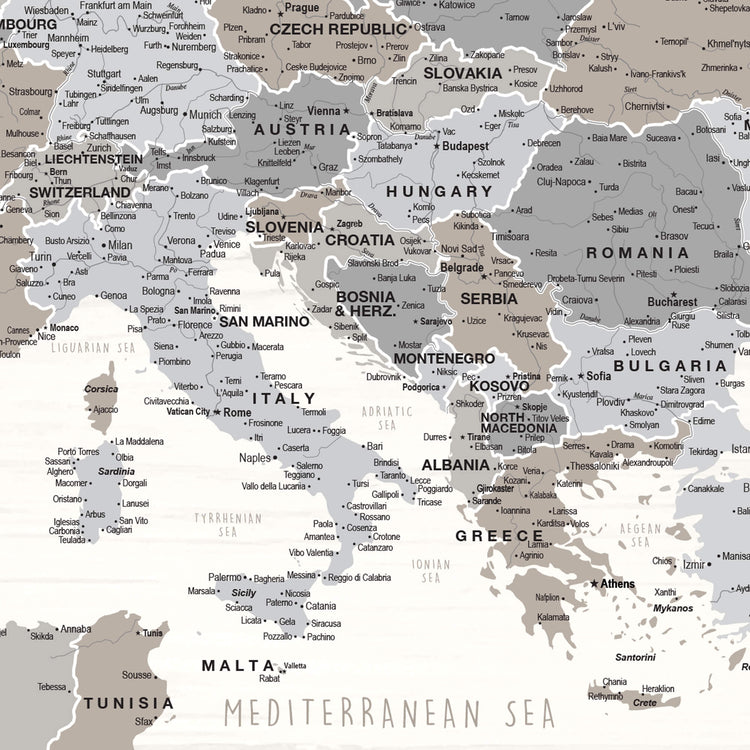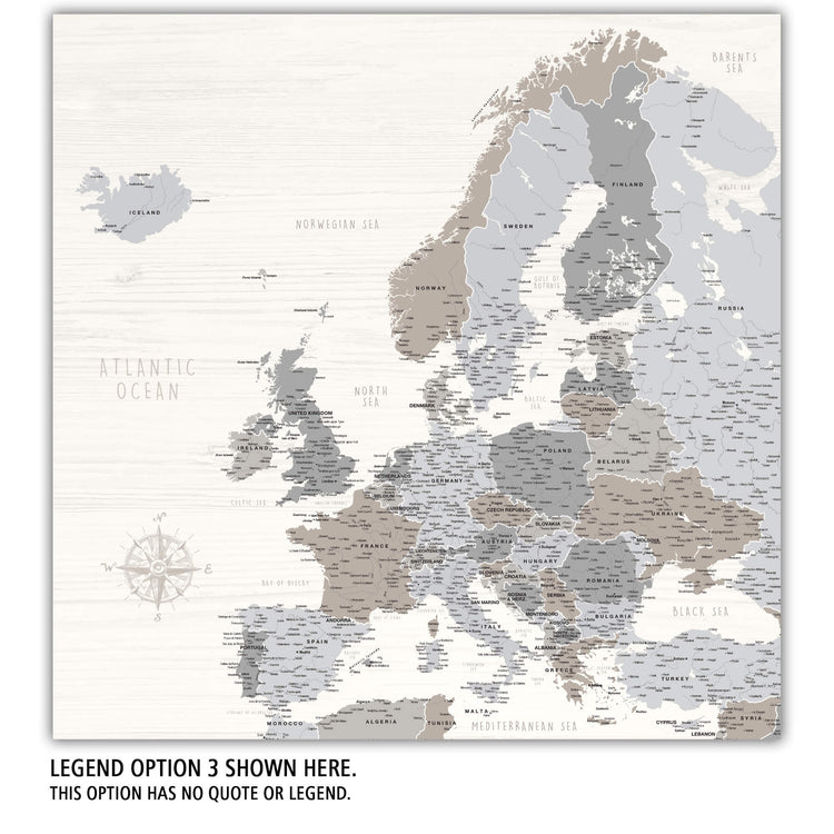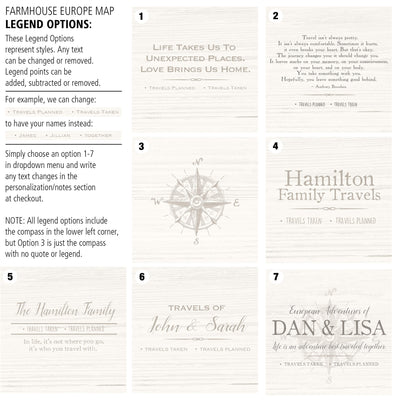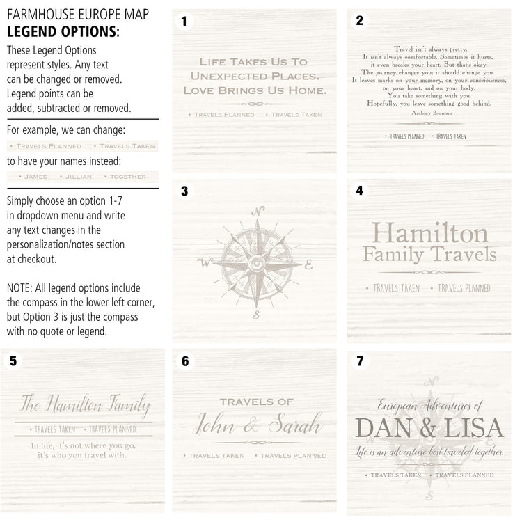 Our Farmhouse Europe Personalized Push Pin Map doubles as beautiful modern farmhouse decor AND a push pin map of the world to track travels taken and travels planned. Map features a whitewash wood grain background perfect for your grey, taupe and white farmhouse decor. Personalized quotes and legends make this a great wedding, new home or gift for the traveler. Pin board map features superb clarity with excellent city and country details. Swipe through additional photos to see personalization options & close-up details.