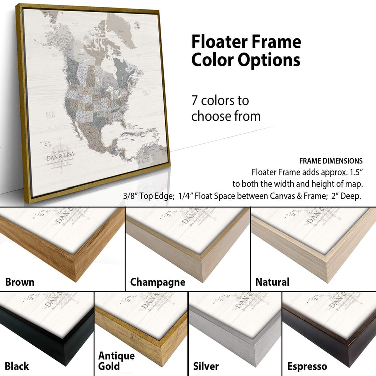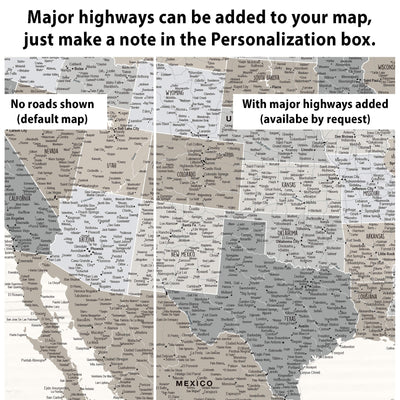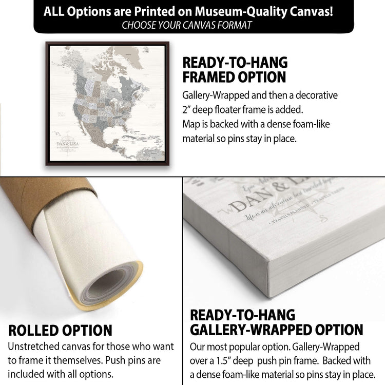 The map is ready to hang, gallery-wrapped around a push pin frame, or you can add a decorative frame (available in most sizes). The superior foam-like backing under our special blended canvas ensures that your pins will stay securely in place. The rolled option comes with no frame or backing; it simply includes the rolled canvas for those who prefer to finish it themselves.