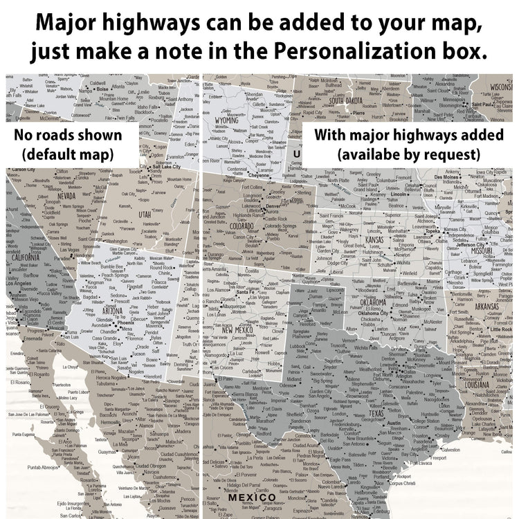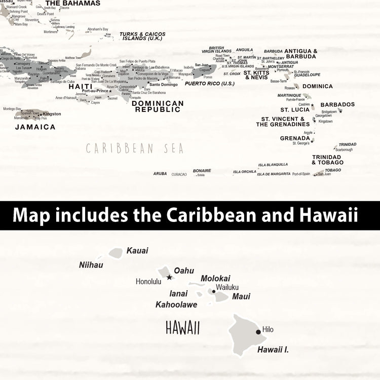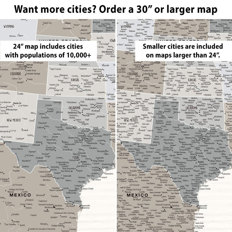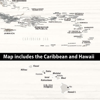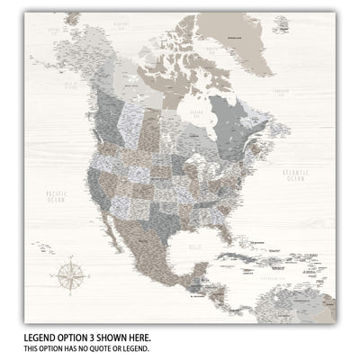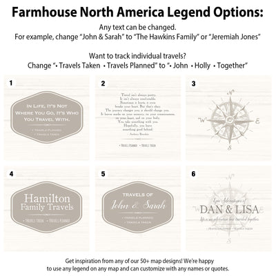 This Farmhouse North America Push Pin Travel Map makes a beautiful statement on any home or office wall and also serves as a great way to record and plan all your travels. Includes the Caribbean and Hawaii. Major highways can be added by request (see listing photos for example). 24" Map includes cities with populations of 10,000+, larger maps includes smaller cities (see listing photos for example). Whitewashed woodgrain background blends with most decors. Map features superb clarity with excellent city and country details. Swipe through additional photos to see personalization options & close-up details.