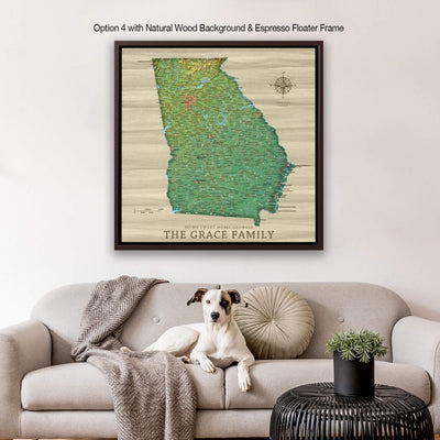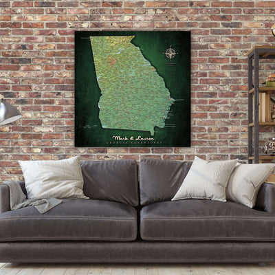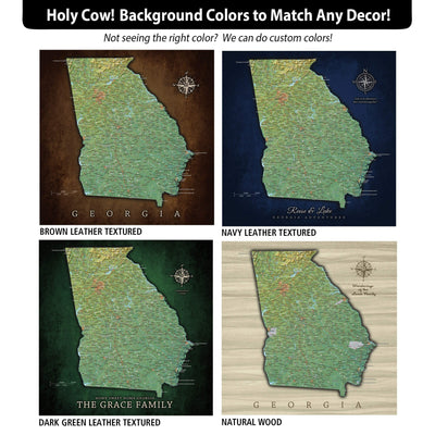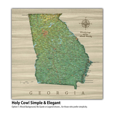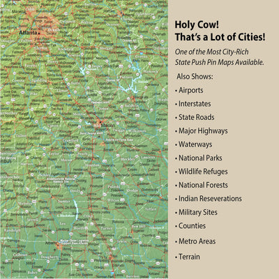 Holy Cow! Georgia State Push Pin Map with Terrain allows you to pin the places you have traveled or have lived in Georgia. Beautiful as wall art showcasing your state pride but fun to start conversations about your favorite places. Superb clarity with more city and towns. Plus "NO CHARGE" for personalization. Makes a great wedding, anniversary, new home or graduation gift to commemorate one's roots for a truly personal gift. Highly detailed, map features roads, highways, interstates, rivers, lakes along with National Parks & Forests, and military sites. Our Georgia Map is gallery-wrapped with a "premium" canvas--better than your box-store quality. Foam-like material under canvas ensures pins stay in place. Easy, lightweight and ready-to-hang; no additional framing necessary; Rolled option is available for those who want to frame map themselves (DIY). Made in USA!