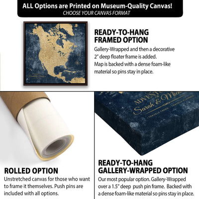 Map is available Ready to hang - gallery-wrapped around a push pin frame or add a decorative frame (available on most sizes). Superior foam-like backing under our special, blended canvas ensures your pins will stay intact. Rolled option includes no frame or backing, simply the rolled canvas for those who want to finish it themselves.