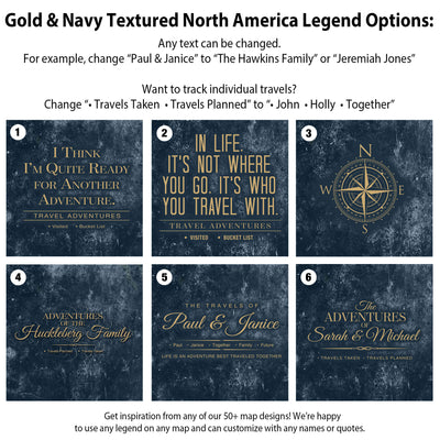 Our Gold & Navy Textured North America Push Pin Travel Map makes a beautiful statement on any home or office wall and also serves as a great way to record and plan all your travels. Includes the Caribbean and Hawaii. Major highways can be added by request (see listing photos for example). 24" Map includes cities with populations of 10,000+, larger maps includes smaller cities (see listing photos for example). Map features superb clarity with excellent city and country details. Swipe through additional photos to see personalization options & close-up details.