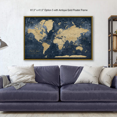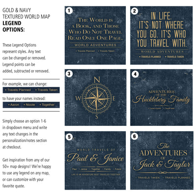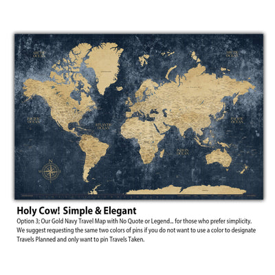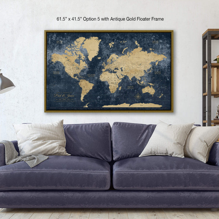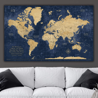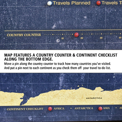 Our Gold & Navy Textured World Map brings classic nautical-like style with a dramatic flair to any room. Perfect for tracking your travels and planning where you're heading next. Plus, keep count of how many countries and continents you've visited with the trackers along the bottom edge.