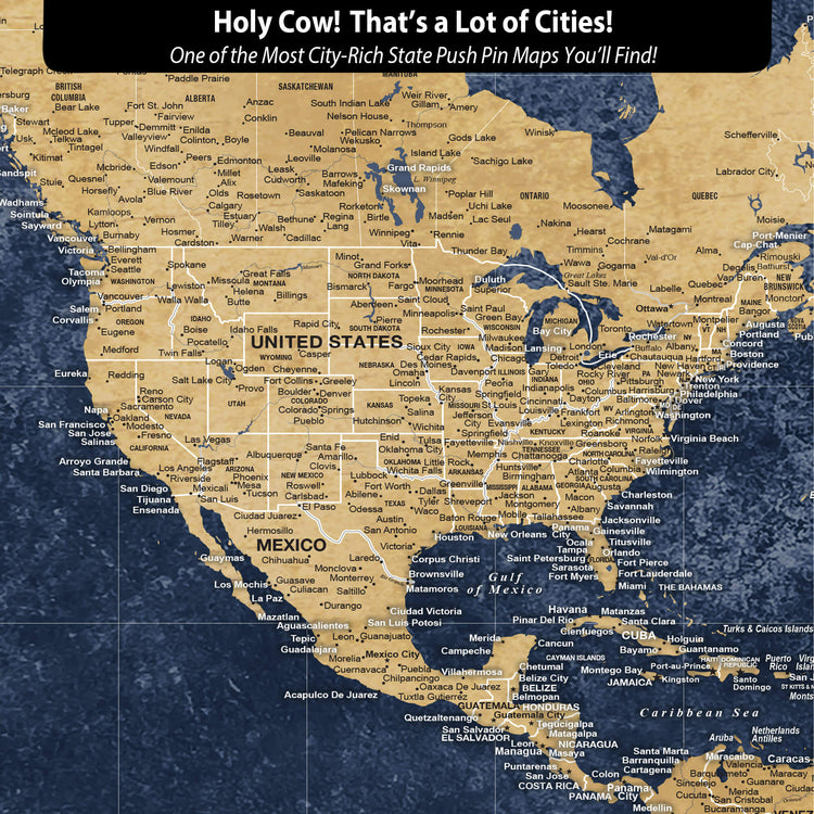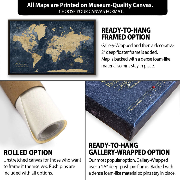 Superb clarity with excellent city and country details. Choose from 3 formats, All feature our Premium Canvas. Canvas hides pinholes if pins are removed and/or changed. Swipe through additional photos to see personalization options & close-up details. EASY to & READY to HANG - no additional framing necessary; Rolled option is available for those who want to frame map themselves.