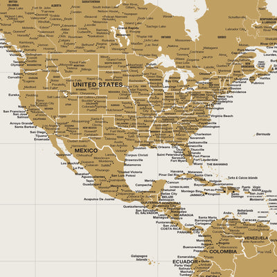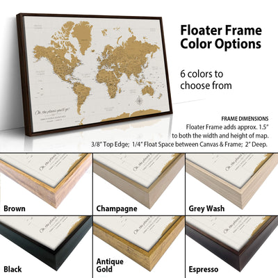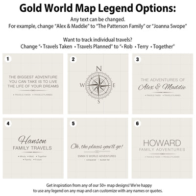 Track your travels on this pinnable world map in beautiful gold and cream. World map with pins is perfect for reminiscing about past adventures and planning new ones. Map can be customized with names and quotes to create a truly one-of-a-kind keepsake. Legend options can be personalized to track individual or family travels. Swipe through additional photos to see personalization options & close-up details.