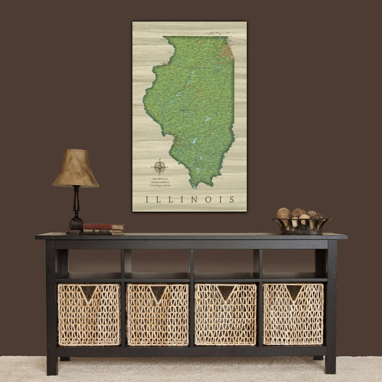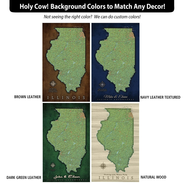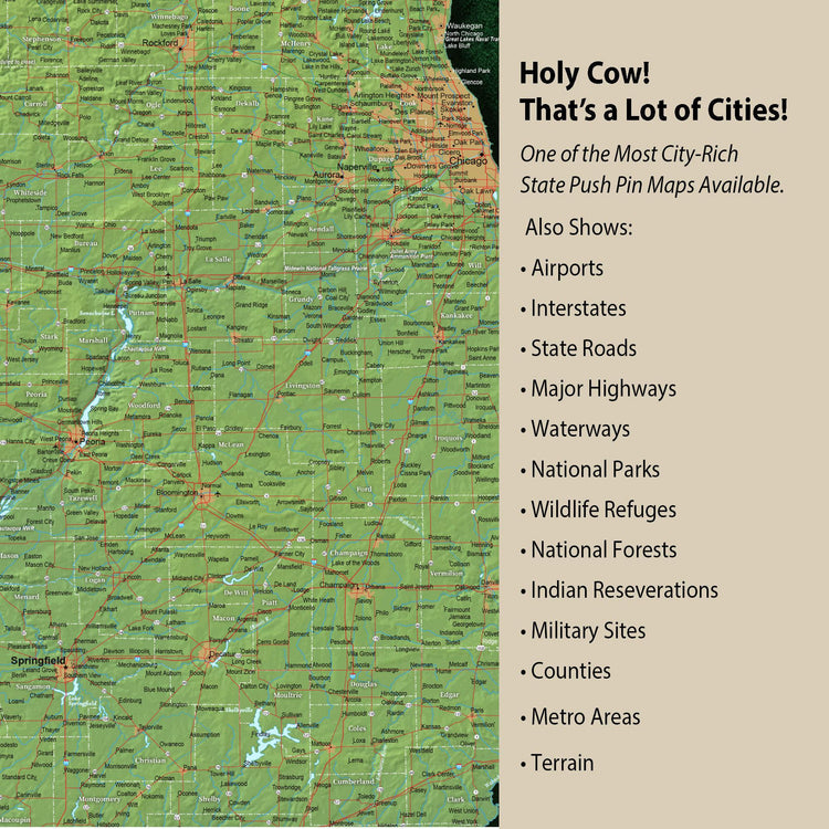 Holy Cow! Illinois State Push Pin Map with Terrain allows you to pin the places you have traveled or have lived in Illinois. Beautiful as wall art showcasing your state pride but fun to start conversations about your favorite places traveled. Superb clarity with more city and towns. Plus "NO CHARGE" for personalization. Makes a great wedding, anniversary, new home or graduation gift to commemorate one's roots for a truly personal gift. Highly detailed, map features roads, highways, interstates, rivers, lakes along with National Parks & Forests, and military sites. Our Illinois Map is gallery-wrapped with a "premium" canvas--better than any box-store quality. Foam-like material under canvas ensures pins stay in place. Easy, lightweight and ready-to-hang; no additional framing necessary. Rolled option is available for those who want to frame map themselves (DIY). Made in the USA.