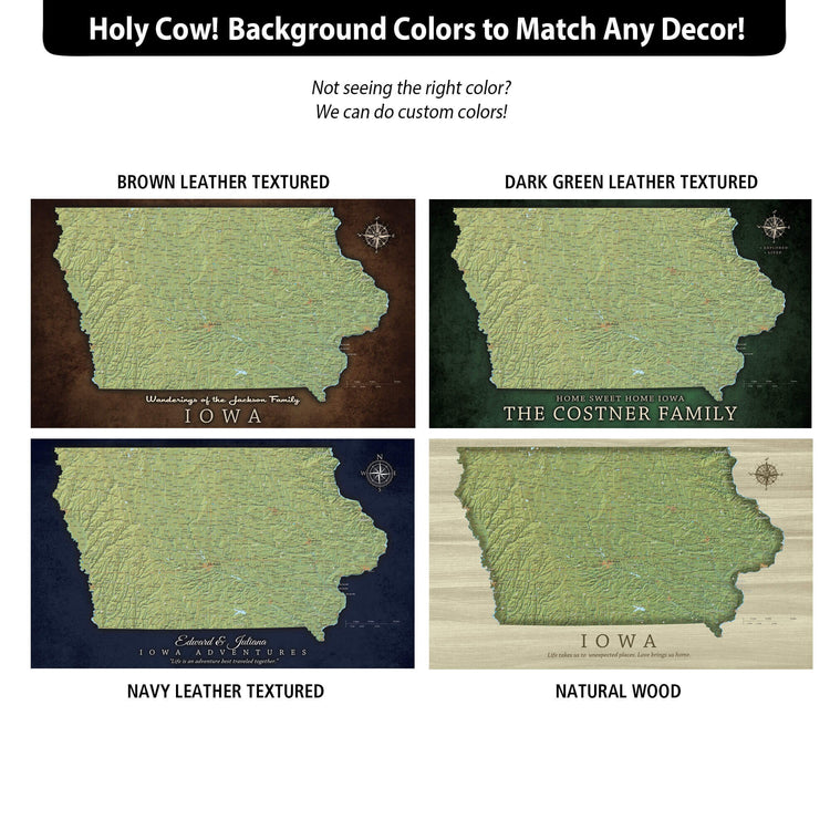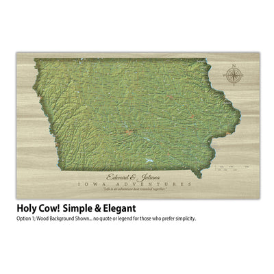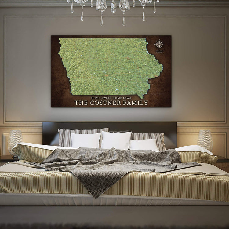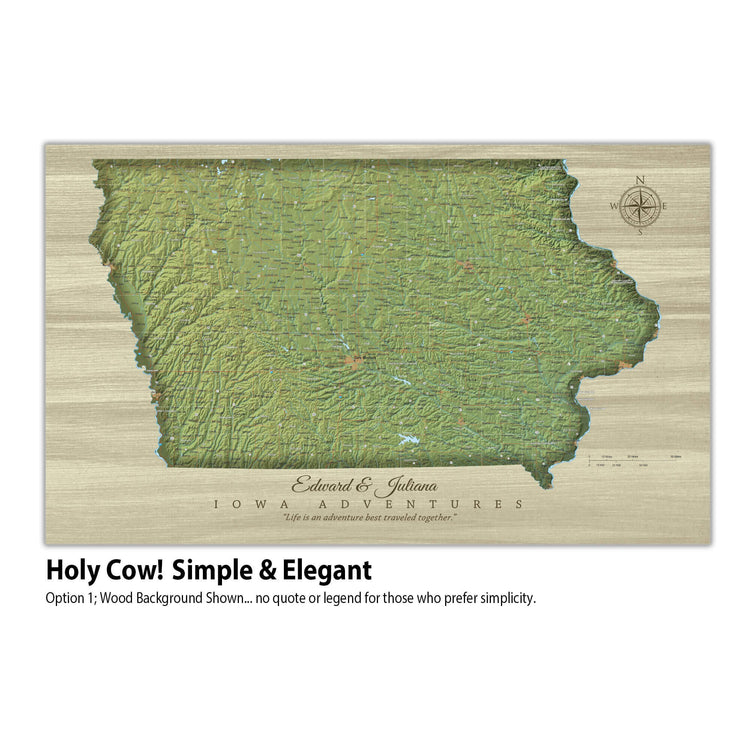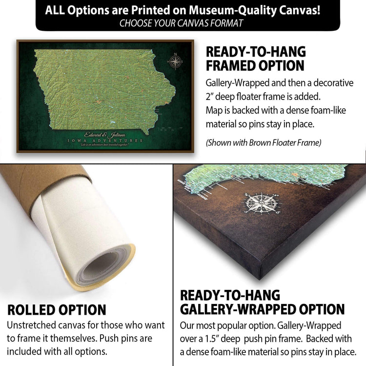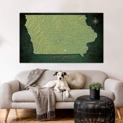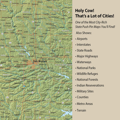 Iowa State Map with Terrain - Pin the places you've Lived and Explored and showcase your favorite State. Superb clarity and one of the most abundant city/town push pin maps you'll find. Makes a great wedding, anniversary, new home or graduation gift to commemorate one's roots. Includes free personalization to add a special touch. Highly detailed, map features roads, highways, interstates, rivers, lakes along with National Parks & Forests, and military sites. Choose Gallery Wrapped, Floater Frame or Rolled (DIY) Formats; we only print on museum-grade, premium canvas.