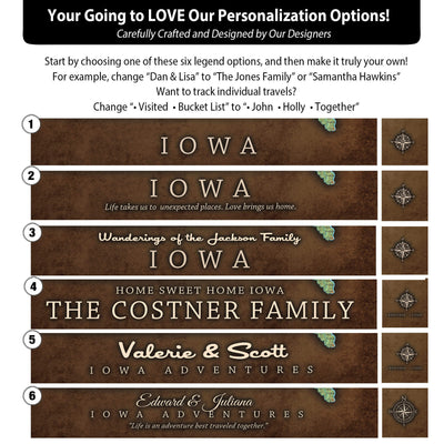 The map can be fully customized. Choose from the quote & legend options shown. Type your custom text in the “Personalize Your Canvas” field.