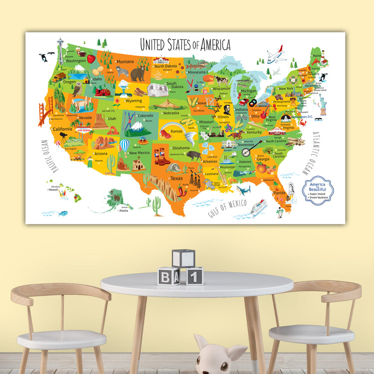 Bright and cheery, this Kids USA Push Pin Map brings a splash of color to any room! Customize the header and/or the legend for a personal touch and create a keepsake they're sure to treasure. Available on your choice of a white or navy background. It's educational, fun, interactive art for your nursery or kids room. How many states have you visited? Where would you like to go? Can you find Vermont? Helps teach geography and state capitals. Also includes some major cities. Have your kids research states to explore what to do and where to go on your next vacation. Kids pin States Visited and Dream Vacations -- helps cherish your family vacation memories. You can even pin pictures on the edges.