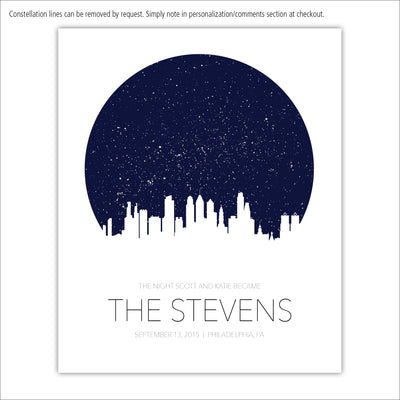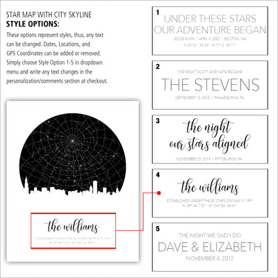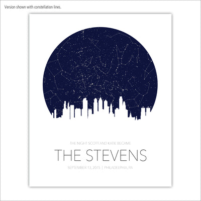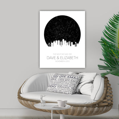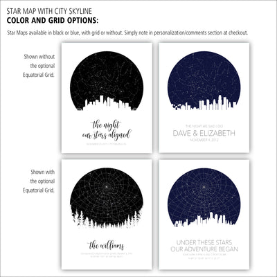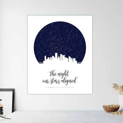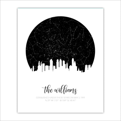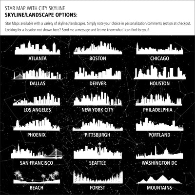 Looking for a truly unique Wedding, Anniversary, or Birthday gift? Reach for the Stars! Our personalized Star Map comes in a variety of large sizes and shows the stars specific to the location, date and time of your choosing. Customize your map with abundant options including the city skyline or landscape of your choice. A truly unique gift and wonderful way to shine a light on that special day over and over again.