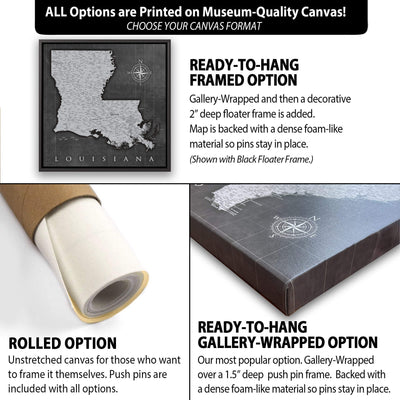 Grey Louisiana State Push Pin Map allows you to pin the places you have traveled or have lived in Louisiana. Or Simply use as beautiful as wall art showcasing your state pride. Great conversation starter. Superb clarity with abundant city and towns. Holy Cow! "NO CHARGE" for personalization. Makes a great wedding, anniversary, new home or graduation gift to commemorate one's roots for a truly custom gift. Highly detailed map features roads, highways, interstates, rivers, lakes along with National Parks & Forests, and military sites. Our Louisiana Map is gallery-wrapped with a "premium" canvas--better than your box-store quality. Foam-like material under canvas ensures pins stay in place. Lightweight, Easy & ready-to-hang; no additional framing necessary; however, a Rolled option is available for those who want to frame map themselves (DIY). Made in the USA!