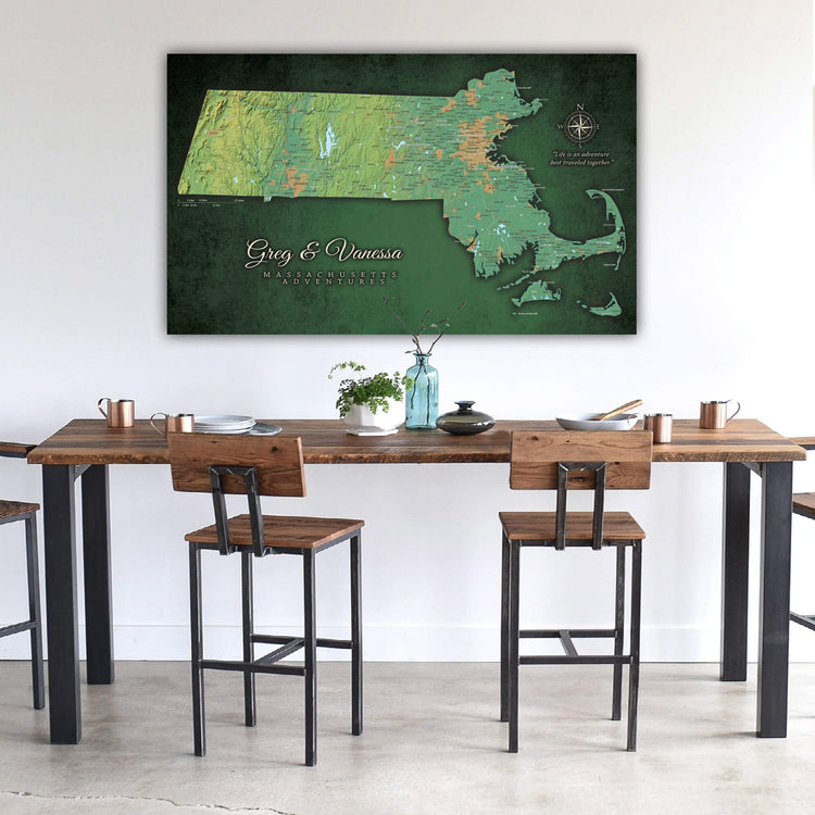 Massachusetts Push Pin Map with Terrain allows you to showcase your travels with beautiful artwork. Pin the places you've been & places you plan to travel. Superb clarity with abundant city and towns. Makes a great wedding, anniversary, new home or graduation gift to commemorate one's roots, and is customizable for a truly personal gift. Highly detailed, map features roads, highways, interstates, rivers, lakes along with National Parks & Forests, and military sites. Our Massachusetts State map is gallery-wrapped with a premium canvas; foam-like material under canvas ensures pins stay in place. Easy and ready-to-hang; no additional framing necessary. Rolled option is available for those who want to frame map themselves (DIY).