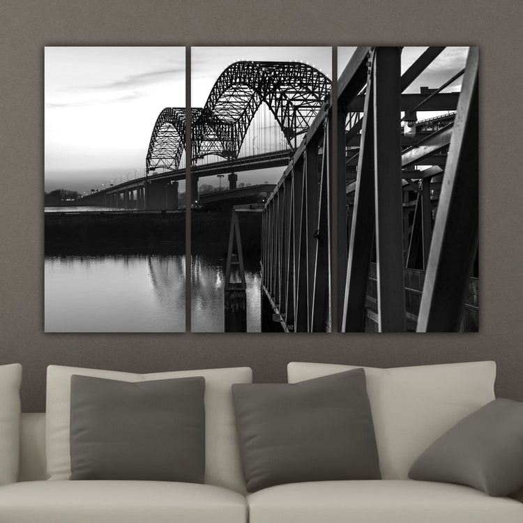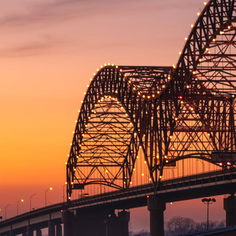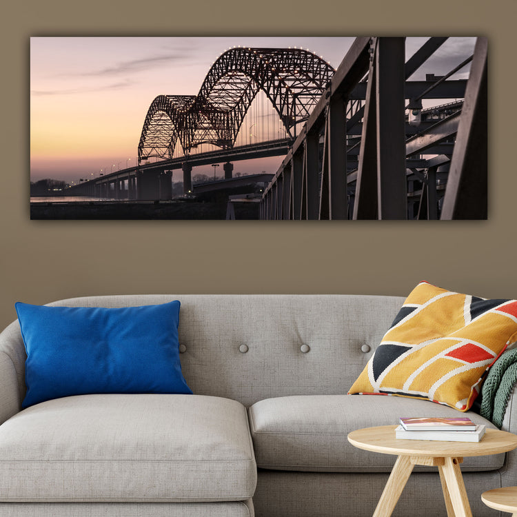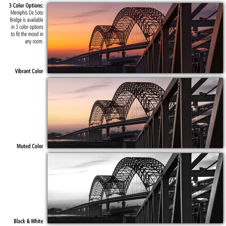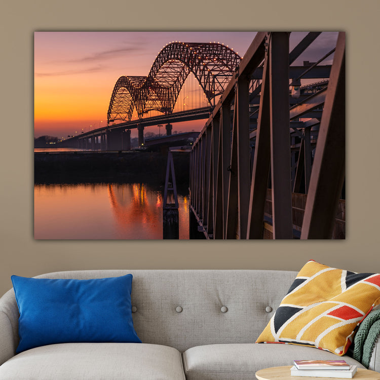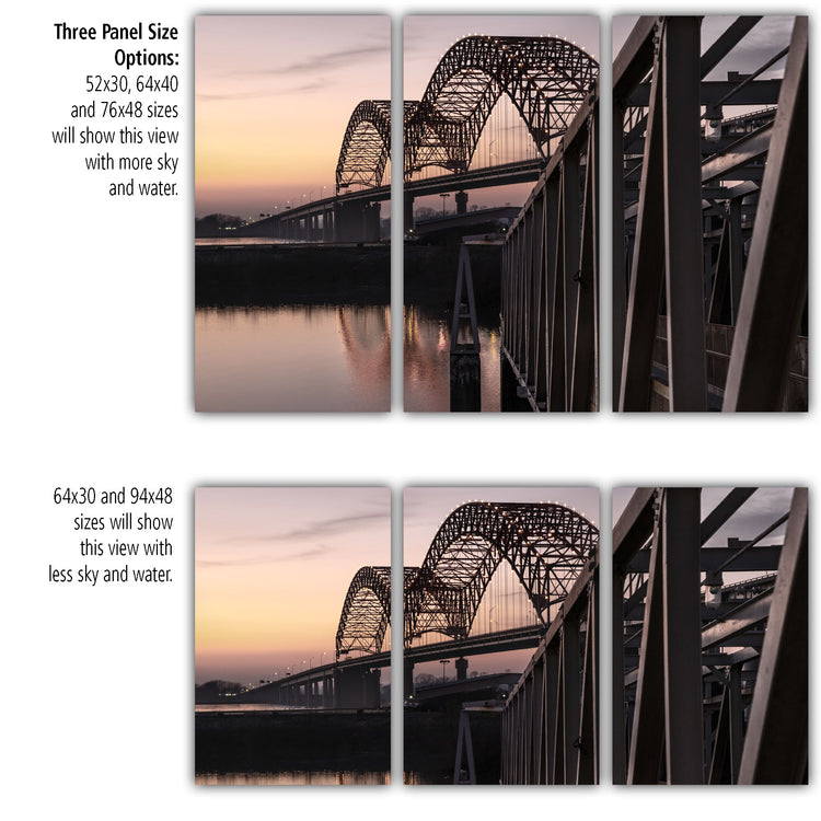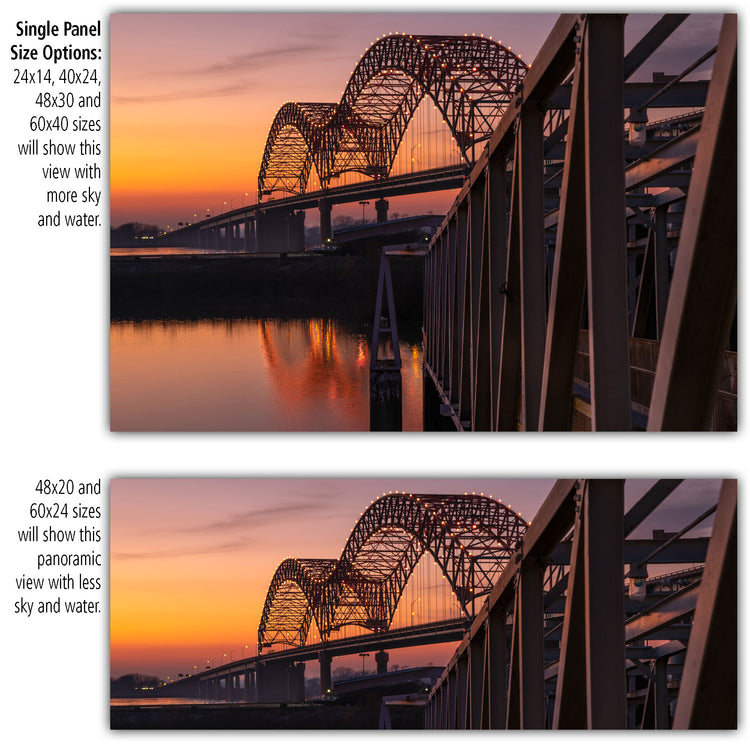 A sunset view of the Hernando de Soto Bridge in Memphis spanning the Mississippi River. Available in 3-Panel sizes up to almost 8' wide, and Single-Panel sizes up to 5' wide. A variety of sizes to fit any wall, and in 3 great color options: vibrant color, muted color and black & white. Perfect for anyone who calls Memphis, TN or West Memphis, AR home.