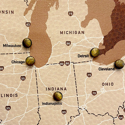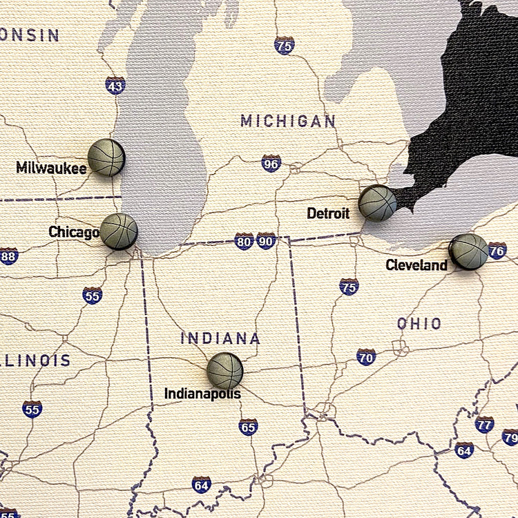 These Metal Basketball Push Pins are specially made to coordinate with our Basketball Stadium Tour maps. Available in silver and gold. Basketball is 7/16" wide, pin is 5/16" long. Order from 1 pin to 30. The more you order the more you save!
