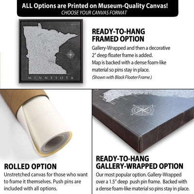 Grey Minnesota State Push Pin Map allows you to pin the places you have traveled or have lived in Minnesota. Beautiful as wall art showcasing your state pride but fun to start conversations. Superb clarity with abundant city and towns. Holy Cow! "NO CHARGE" for personalization. Makes a great wedding, anniversary, new home or graduation gift to commemorate one's roots for a truly custom gift. Highly detailed map features roads, highways, interstates, rivers, lakes along with National Parks & Forests, and military sites. Our Minnesota Map is gallery-wrapped with a "premium" canvas--better than your box-store quality. Foam-like material under canvas ensures pins stay in place. Lightweight, Easy & ready-to-hang; no additional framing necessary, however Rolled option is available for those who want to frame map themselves (DIY). Made in the USA!
