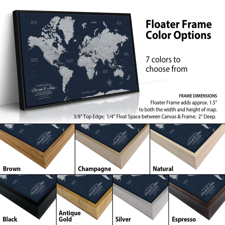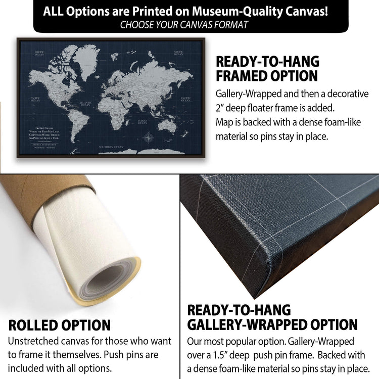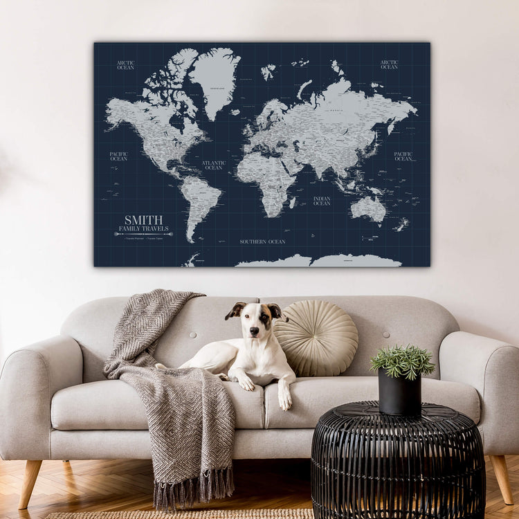 Navy World Push Pin Map with tones of grey in a Single Panel. Traditional, Modern or Classic, this map coordinates with most styles. Great clarity with excellent city and country details, map is READY to HANG. No additional framing necessary. Foam-like backing under our special, blended canvas ensures your pins will stick and stay intact.