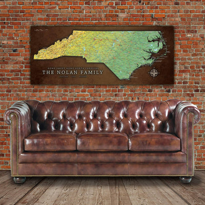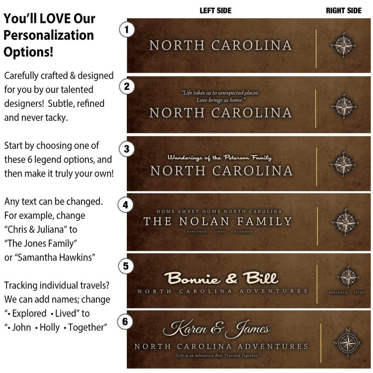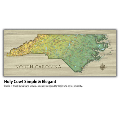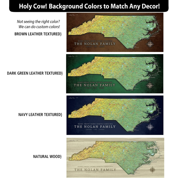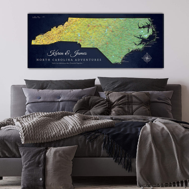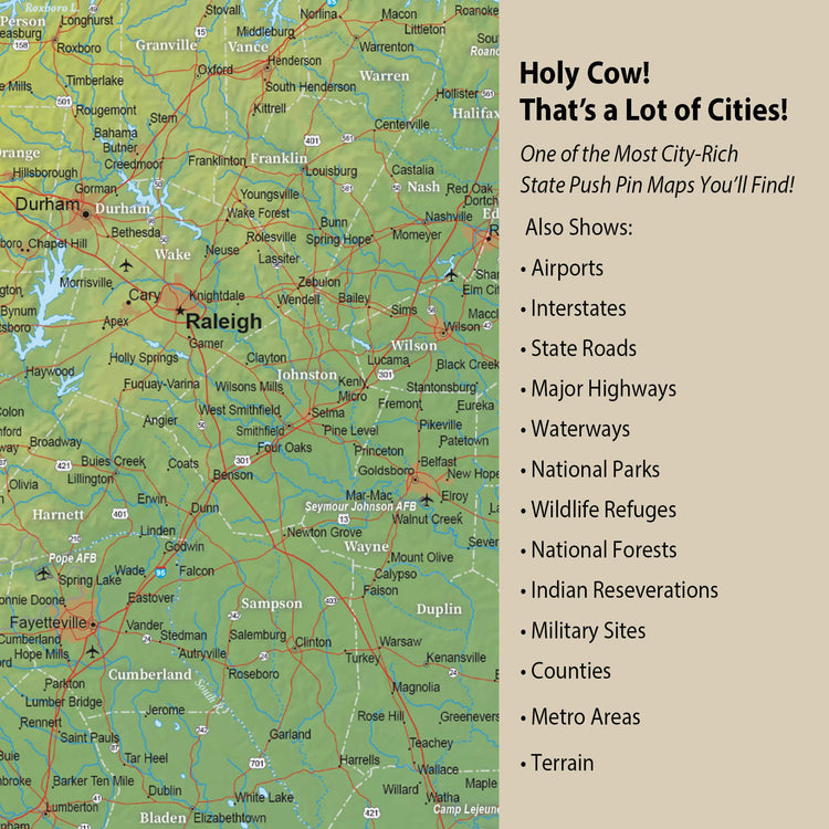 Holy Cow! Our North Carolina Push Pin Map with Terrain allows you to pin the places you have traveled or have lived in North Carolina. Beautiful as wall art showcasing your state pride but fun to start conversations about your favorite places traveled. Superb clarity with more city and towns. "NO CHARGE" for personalization. Makes a great wedding, anniversary, new home or graduation gift to commemorate one's roots for a truly personal gift. Highly detailed, map features roads, highways, interstates, rivers, lakes along with National Parks & Forests, and military sites. This State map is gallery-wrapped with a premium canvas--better than any box-store quality. Foam-like material under canvas ensures pins stay in place. Easy, lightweight and ready-to-hang; no additional framing necessary. Rolled option is available for those who want to frame map themselves (DIY).