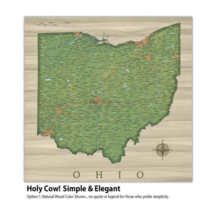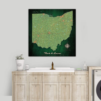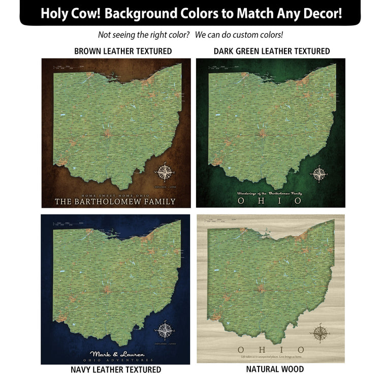 Our Ohio State Push Pin Map with Terrain allows you to pin the places you have traveled or have lived in Ohio. Beautiful as wall art showcasing your state pride but fun to start conversations about your favorite places traveled. Superb clarity with more city and towns. Holy Cow! "NO CHARGE" for personalization. Makes a great wedding, anniversary, new home or graduation gift to commemorate one's roots for a truly custom gift. Highly detailed, map features roads, highways, interstates, rivers, lakes along with National Parks & Forests, and military sites. Ohio Map is gallery-wrapped with a "premium" canvas--better than box-store quality. Foam-like material under canvas ensures pins stay in place. Easy, lightweight and ready-to-hang; no additional framing necessary; Rolled option is available for those who want to frame map themselves (DIY).