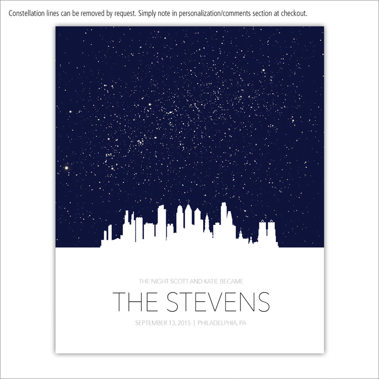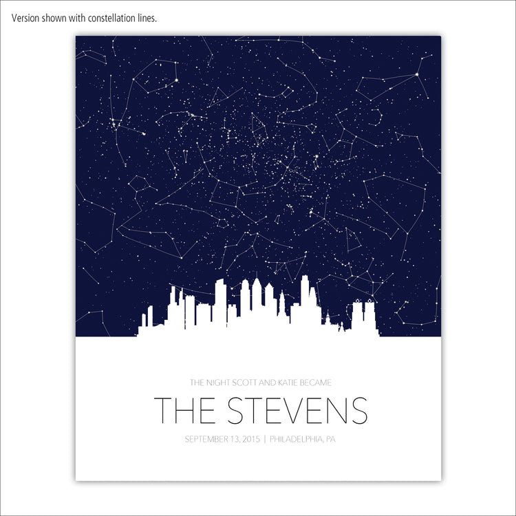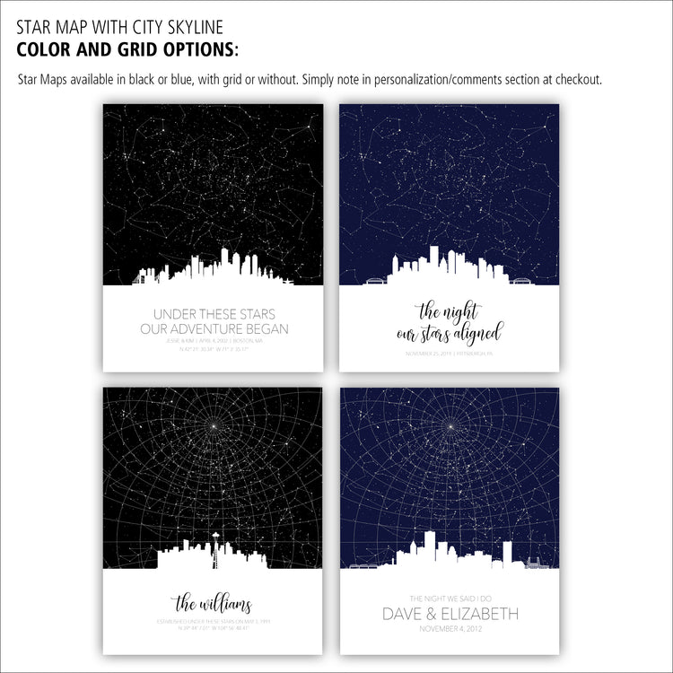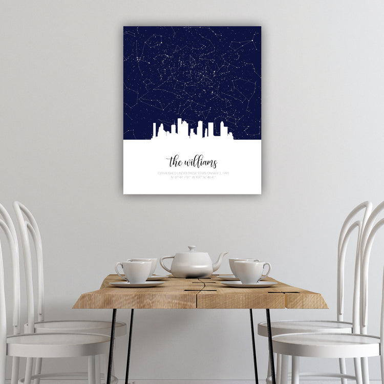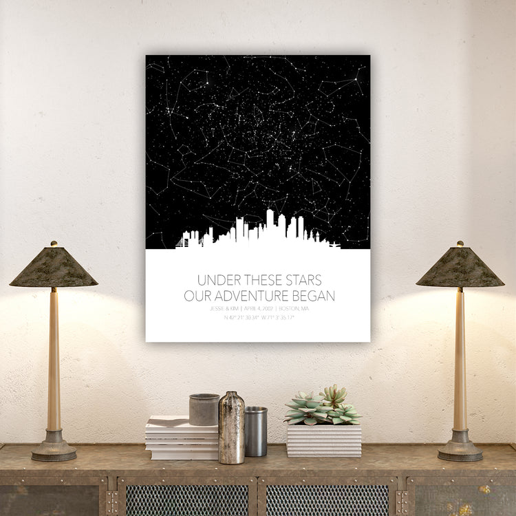 Holy Cow, Reach for the Stars with our personalized Star Map with Skyline of your Choice! Comes in a variety of large sizes and shows the stars specific to the location, date and time of your choosing. Customize your map with abundant options. Available ready-to-hang or as a print-only. A truly unique gift for a wedding, anniversary, or new baby and a wonderful way to shine a light on that special day over and over again.