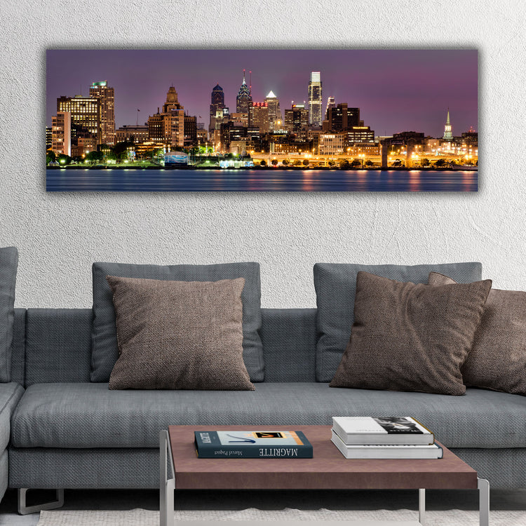 Philadelphia Skyline canvas art stretched and ready to hang. Canvas is professionally hand-stretched and gallery-wrapped at my Holy Cow Canvas studio. I strive to find the best materials at the best price, giving you everyday value beyond gimmicky coupon offers from the canvas giants.