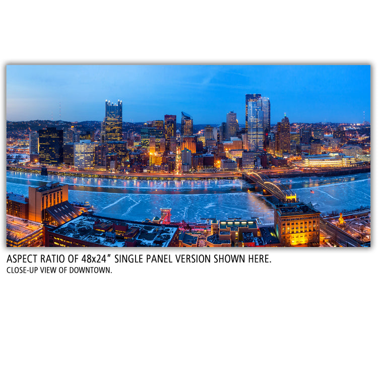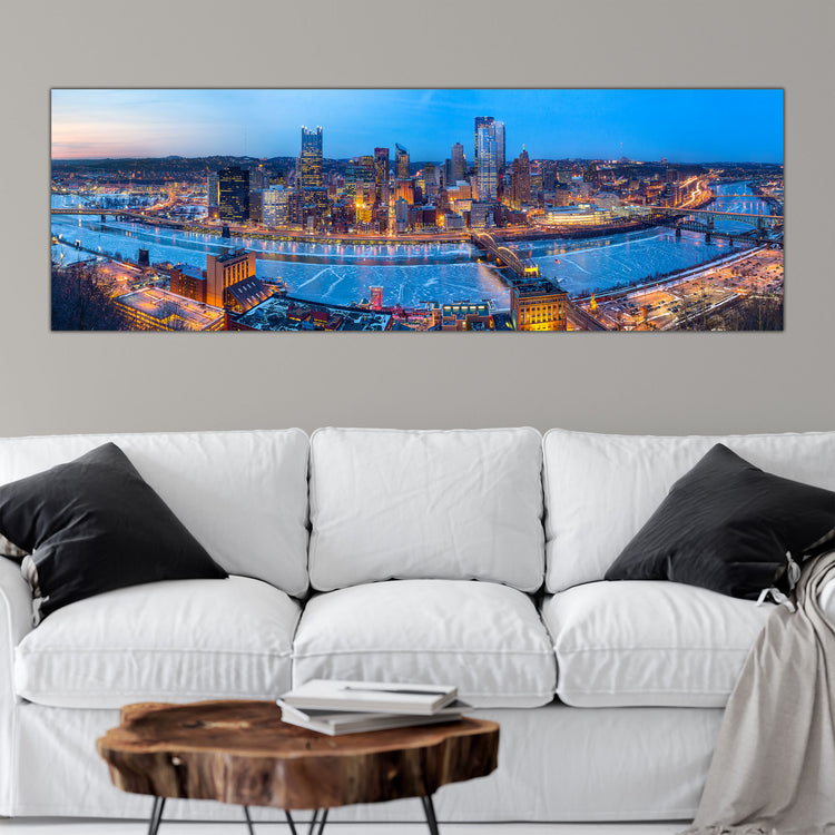 Pittsburgh Skyline on Canvas, beautiful panoramic artwork makes it easy to fill or freshen your walls in your home or office. Large three panel, panoramic photo taken at sunset from Mount Washington is more than 10' wide as shown in main photo. Also available in single panel options up to 5' wide.