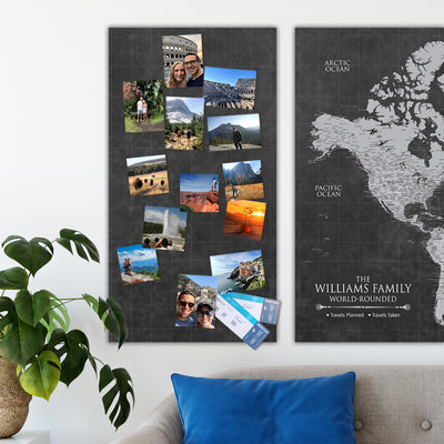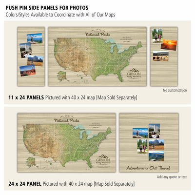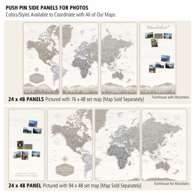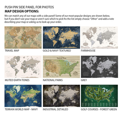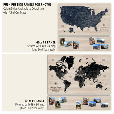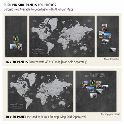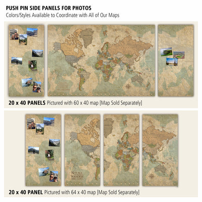 The perfect side panel to compliment your map. Use push pins to showcase photos, tickets and souvenirs next to your Holy Cow Canvas Map. Available in colors/styles and various sizes to match all of our push pin maps. Side panels can be personalized with text of your choice for a one-of-a-kind travel gift. Lightweight. Foam-like backing ensures pins stay in place. Buy two, one for each side, and save.