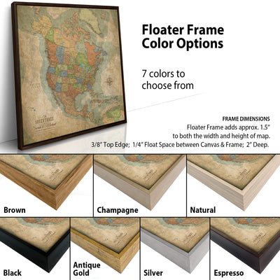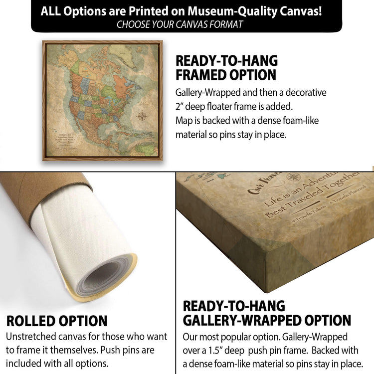 Map is available Ready to hang - no additional framing necessary, gallery-wrapped around a push pin frame. Superior foam-like backing under our special, blended canvas ensures your pins will stay intact. Rolled option includes no frame or backing, simply the rolled canvas for those who want to finish it themselves.