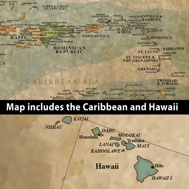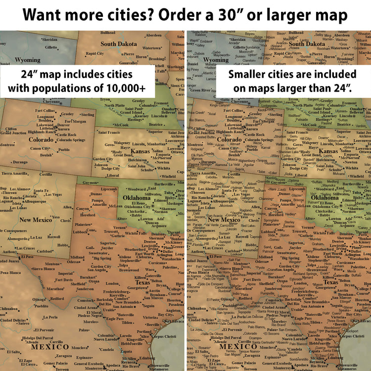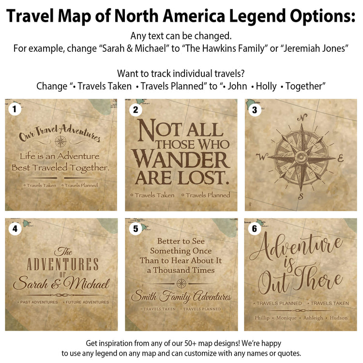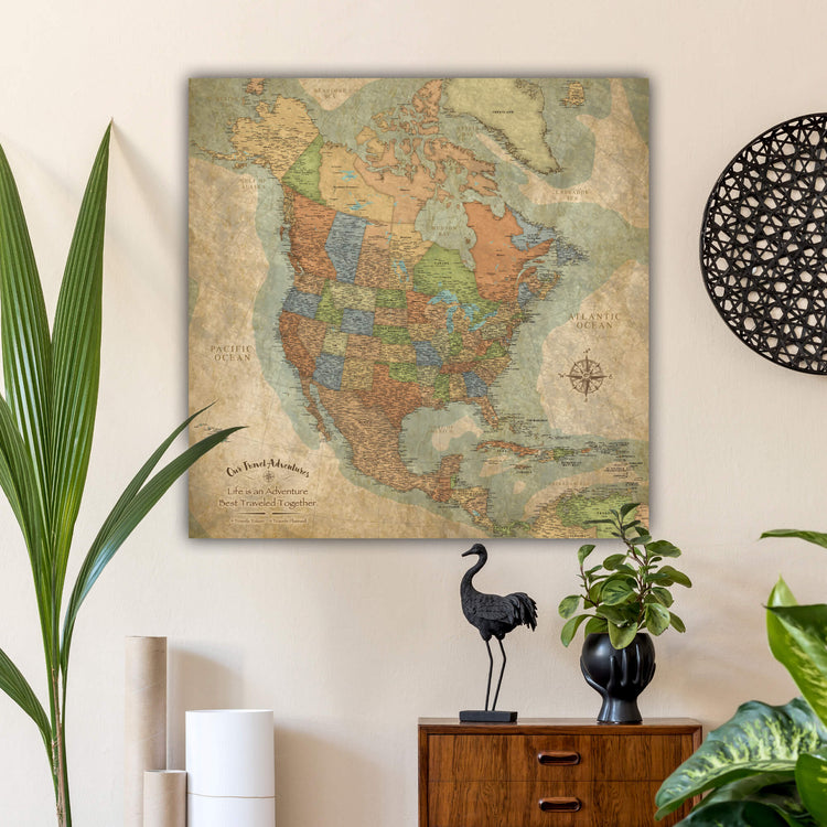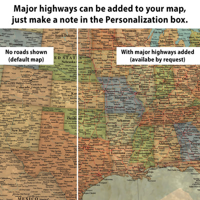 This Push Pin North America Travel Map makes a beautiful statement on any home or office wall and also serves as a great way to record and plan all your travels. Includes the Caribbean and Hawaii. Major highways can be added by request (see listing photos for example). 24" Map includes cities with populations of 10,000+, larger maps includes smaller cities (see listing photos for example). Rich, vintage earth-tones blend with most decors. Map features superb clarity with excellent city and country details. Swipe through additional photos to see personalization options & close-up details.