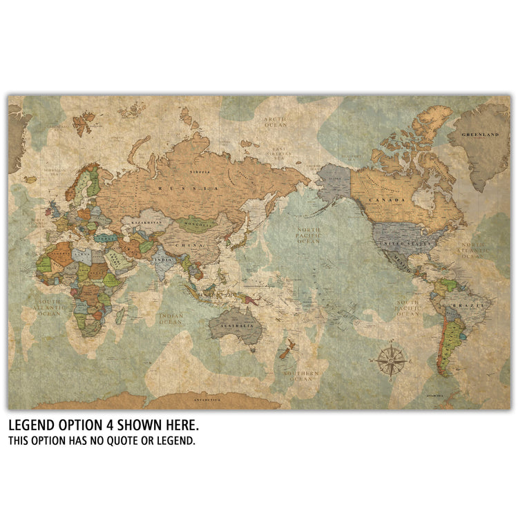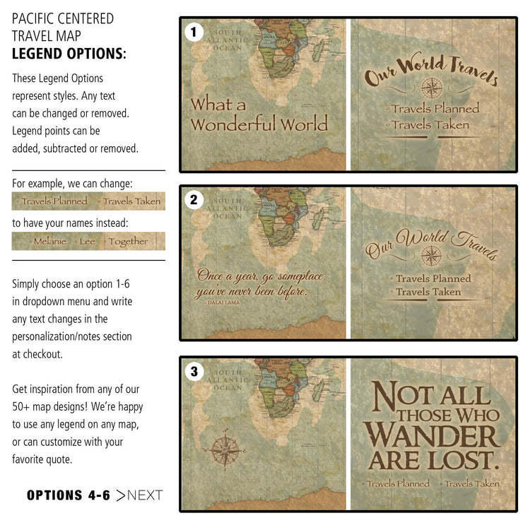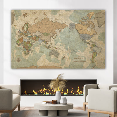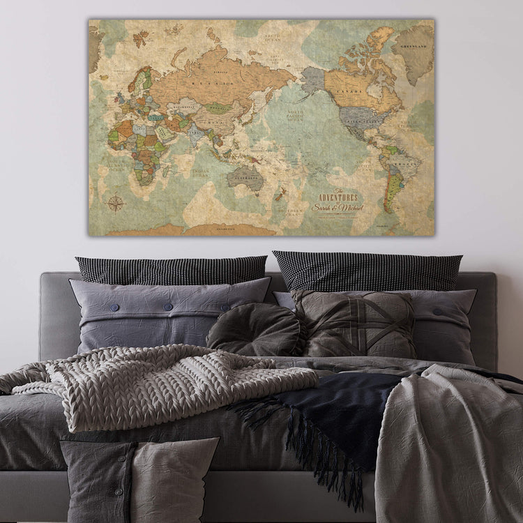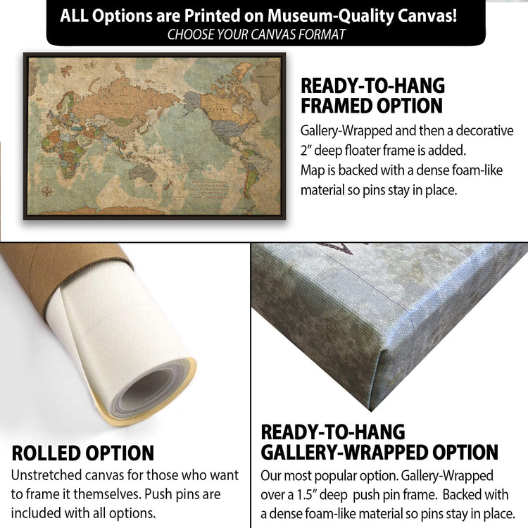 This Pacific-Centered Travel Map offers a unique perspective on the world with Africa on the left side of the canvas. This canvas makes a statement in any home or office and is a great way to record and plan all your travels. Beautiful vintage earth tones blend with most decors. Map features superb clarity with excellent city and country details. Gallery-Wrapped Map is Ready to hang - no additional framing necessary. Superior foam-like backing under our special, blended canvas ensures your pins will stay intact.