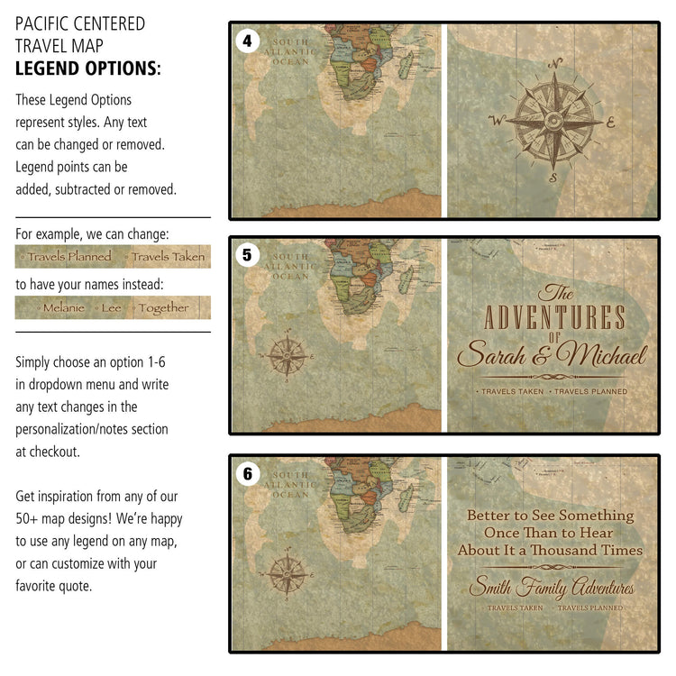 The map can be fully customized. Choose from the quote & legend options shown. Type your custom text in the “Personalize Your Canvas’ field.